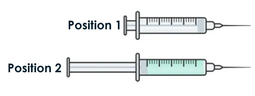 - It is also possible to use the 'vacuum' effect of the syringe to pump the liquid out: carefully pull the handle of the syringe, so that the vacuum of the tube can suck up some liquid and the syringe ends up in position 2 (image).