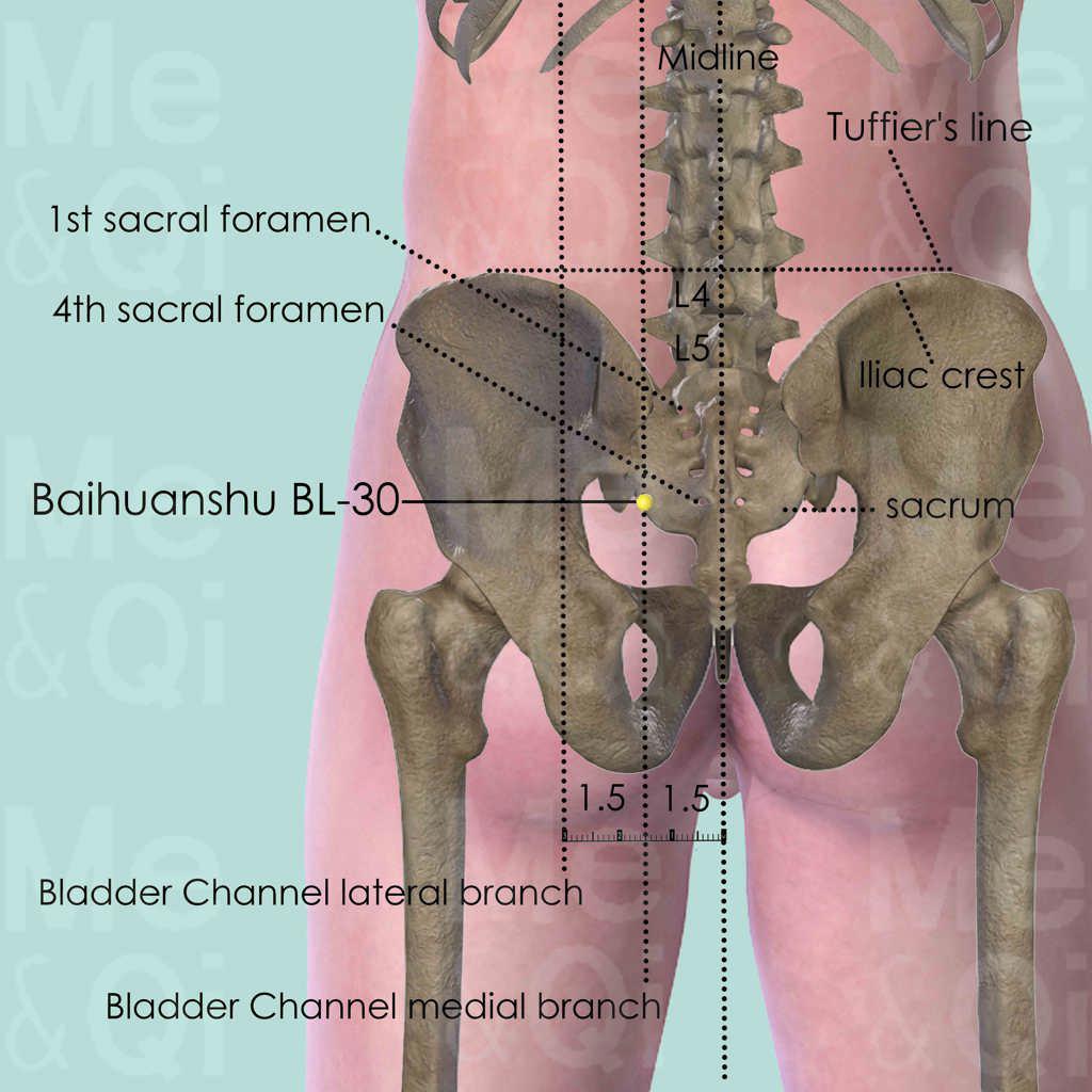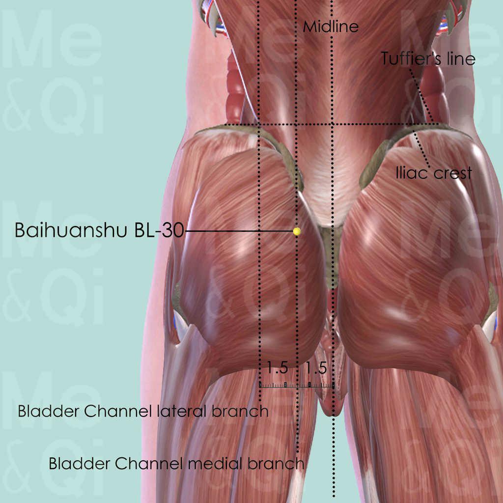 The point's name BaiHuan (White Ring) refers to 'Anus', because BL-30 is mostly used for anus disorders, such as haemorrhoids, prolapse and spasm of anus and incontinence of stools.