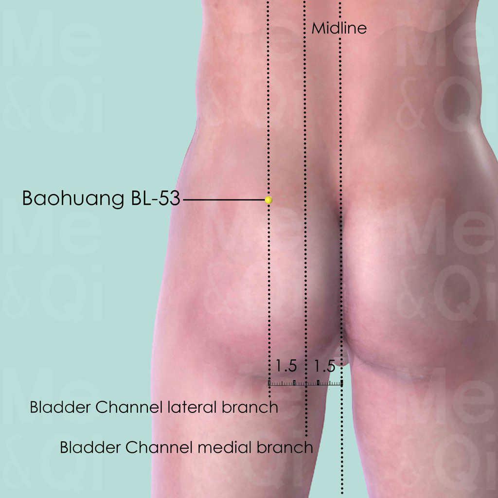 First identify the Tuffier's line which connects the highest points of the iliac crest. The spinous process of the 4th lumber vertebra (L4) mostly falls on this line. Then palpate in an inferior direction, passing L5, and reach the most superior 1st sacral foramen. Palpate further to the 2nd sacral foramen. Baohuang BL-53 is at the level of the 2nd sacral foramen and 3 cun lateral to the posterior midline. Points located between Fufen BL-41 and Zhibian BL-54 are in the lateral branch of the Bladder Channel, while these between Fengmen BL-12 and Baihuanshu BL-30 are in the medial branch.