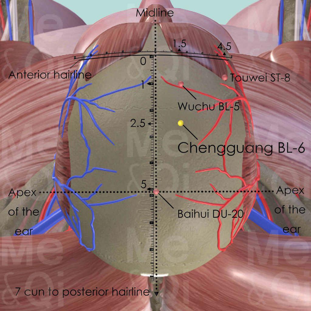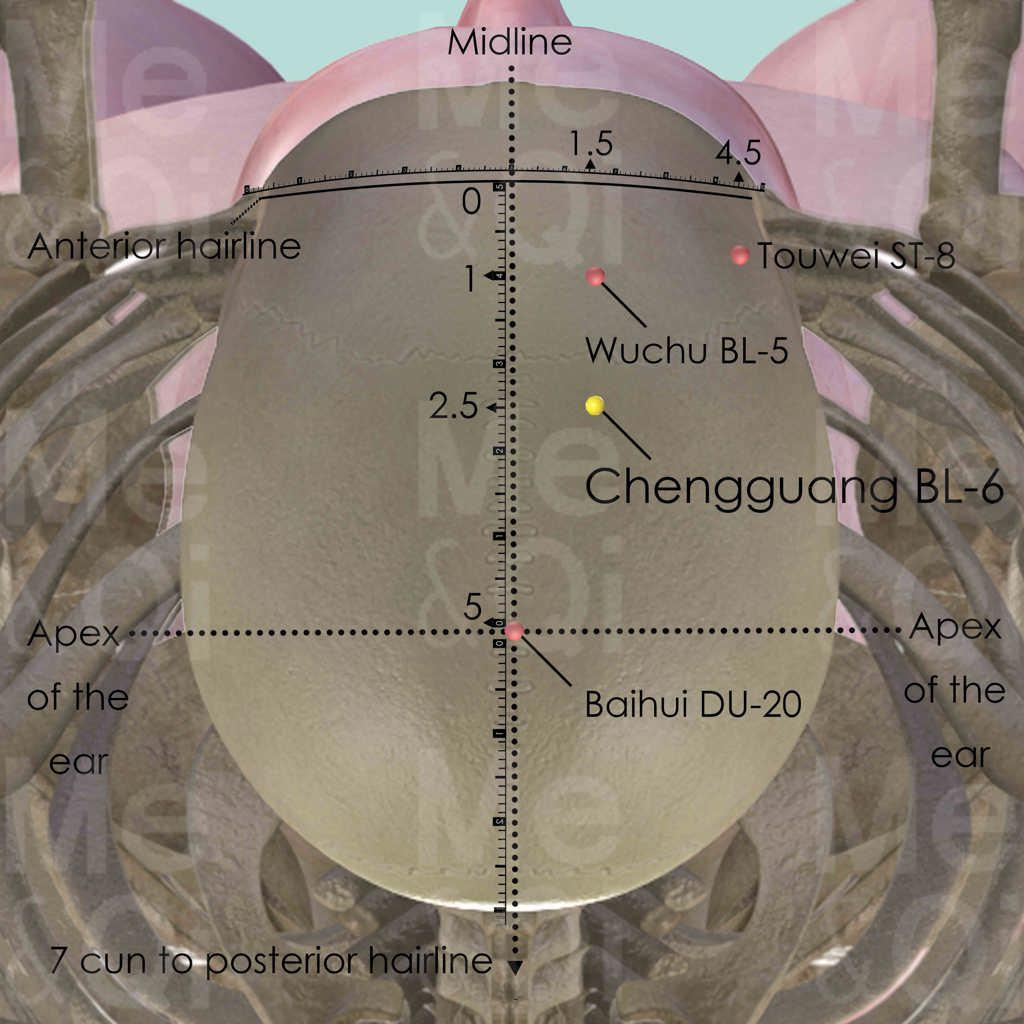 First locate the midpoint of the anterior hairline and Baihui DU-20 on the vertex. The distance between these two point is 5 cun. Chengguang BL-6 is in the midpoint of these two reference points and also 1.5 cun lateral to the anterior midline.
