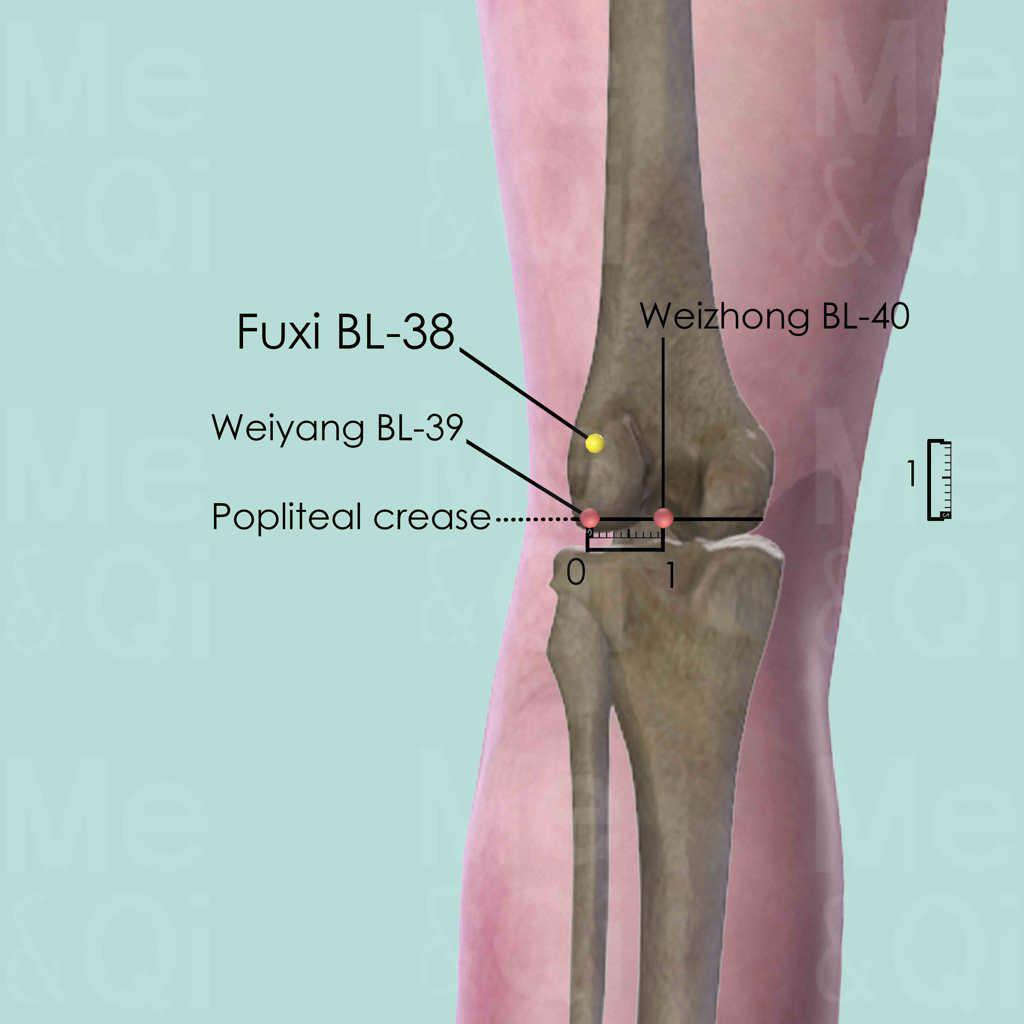 First flex the knee slightly in order to reveal the popliteal crease. Then force the knee against resistance so that the tendon of the biceps femoris muscle becomes more pronounced and visible. Fuxi BL-38 is located 1 cun superior to the knee joint on the medial border of the tendon.