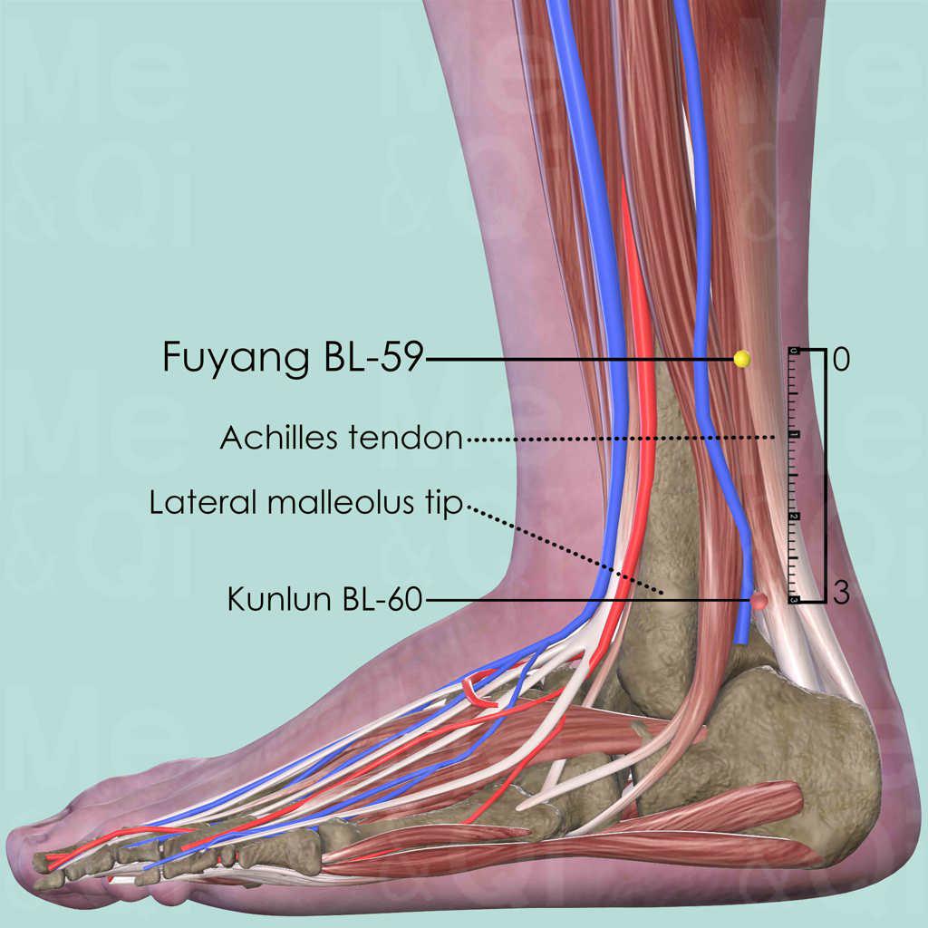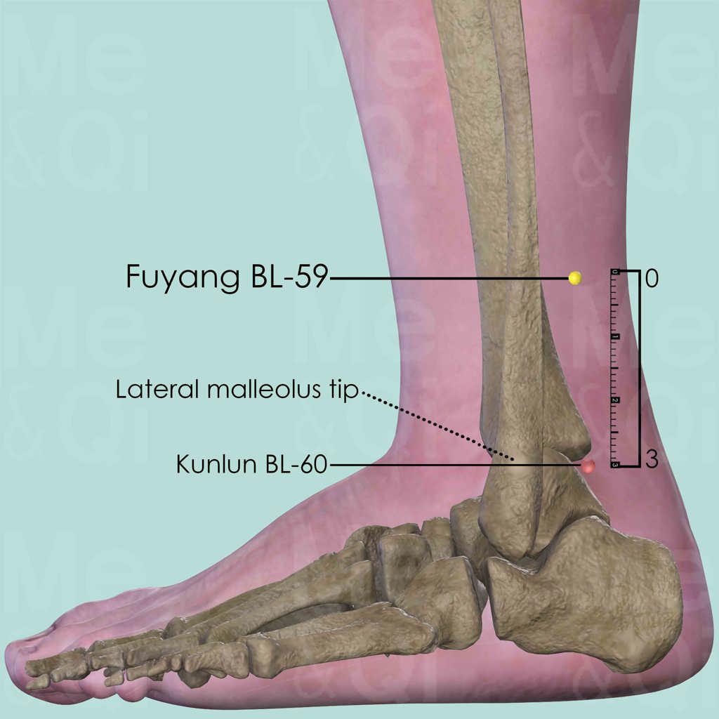First identify Kunlun BL-60 in the depressions between the malleolus tip and the Achilles tendon. Locate Fuyang BL-59 3 cun directly above Kunlun BL-60 and on the lateral aspect of the lower leg.