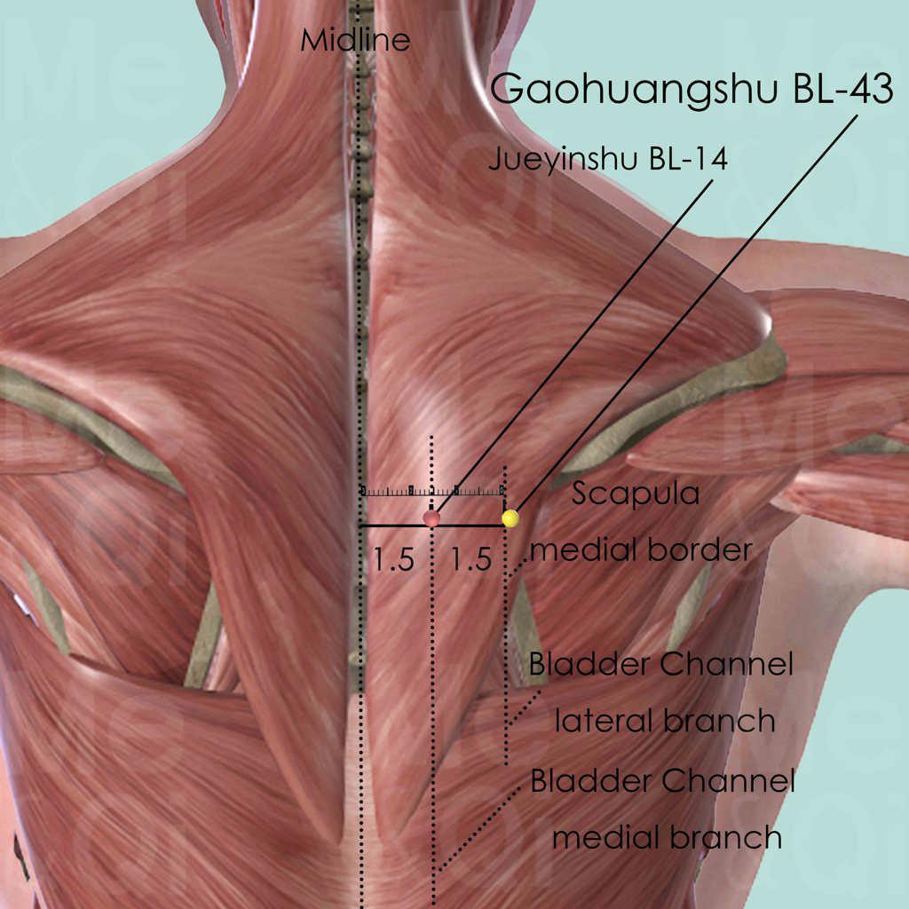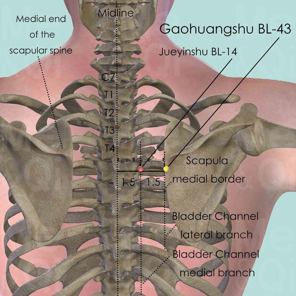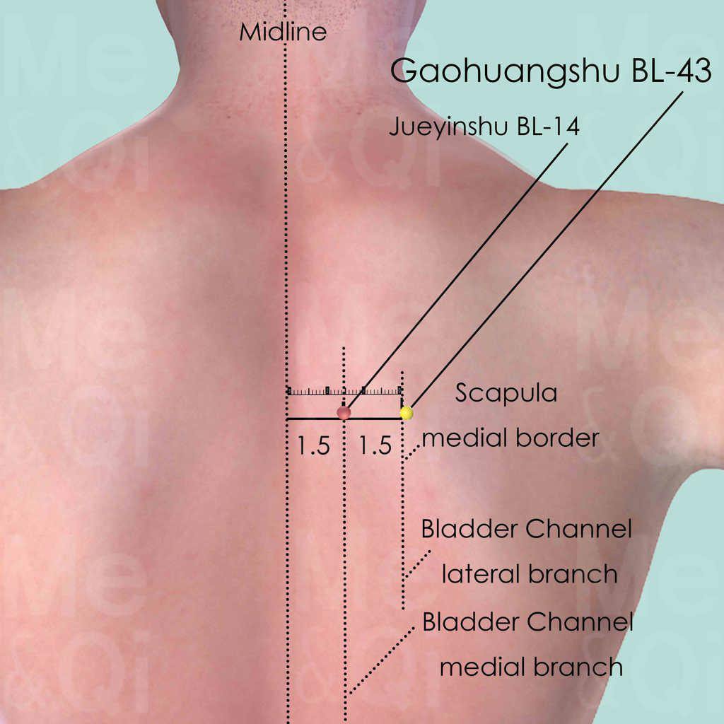 'Gaohuang' refers to the space between the Heart and diaphragm, and it is supposed to be the most difficult part of the body any medical treatments can reach. Thus Gaohuangshu BL-43 is often used in chronic diseases with great debility.