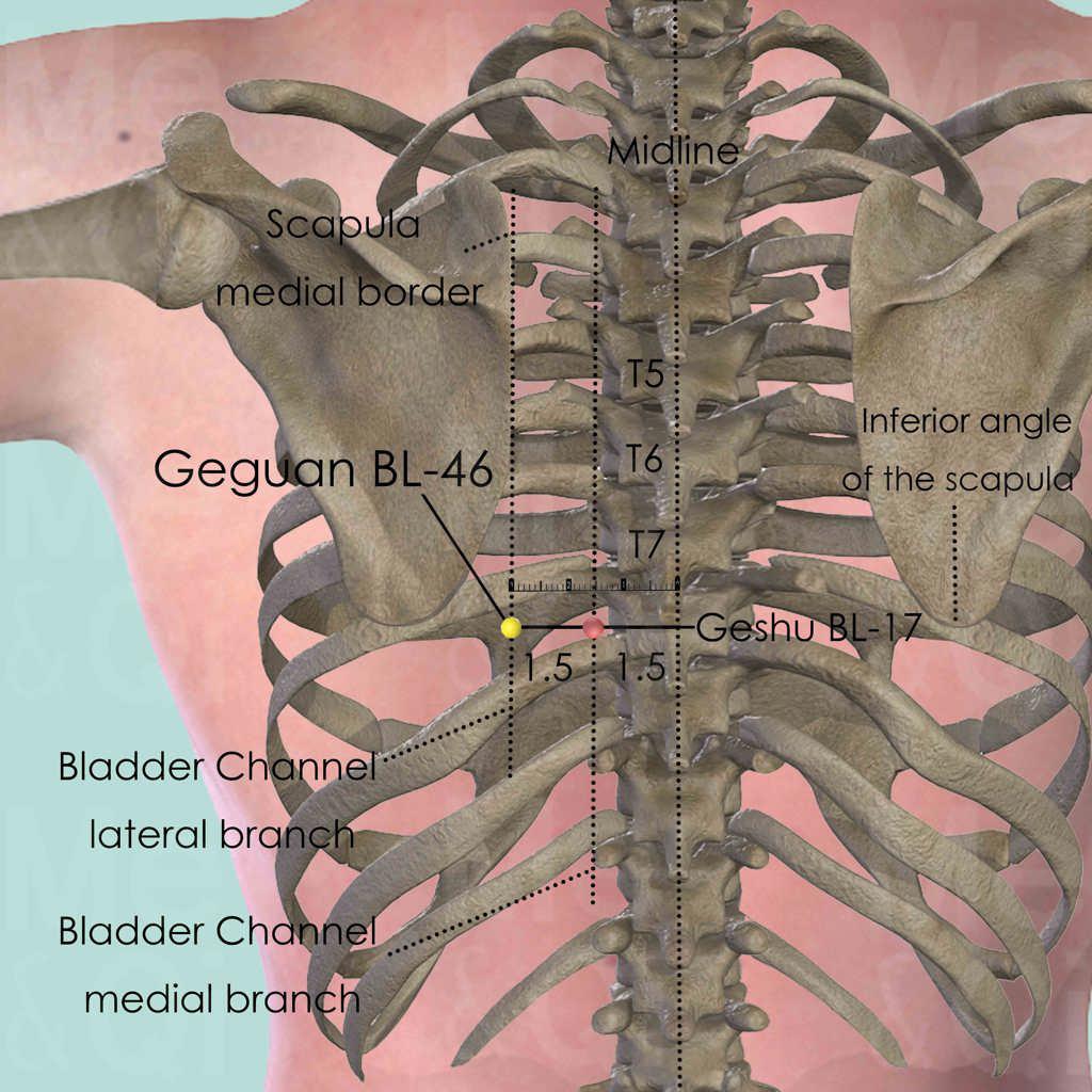 First locate the spinous process of the 7th cervical vertebra (C7), which is still palpable when the neck is being flexed and extended, while the 6th cervical vertebra (C6) starts to slide anteriorly and gradually disappears. The spinous process of the 7th thoracic vertebra (T7) is seven spinous process below C7. Or directly locate the spinous process of T7, which is level with the inferior angle of the scapula, when the patient is seated with their arms hanging down. Geguan BL-46 is 3 cun lateral to the lower border of T7. Geshu BL-17 is at the same level but 1.5 cun lateral to T7. Points located between Fufen BL-41 and Zhibian BL-54 are in the lateral branch of the Bladder Channel, while these between Fengmen BL-12 and Baihuanshu BL-30 are in the medial branch.
