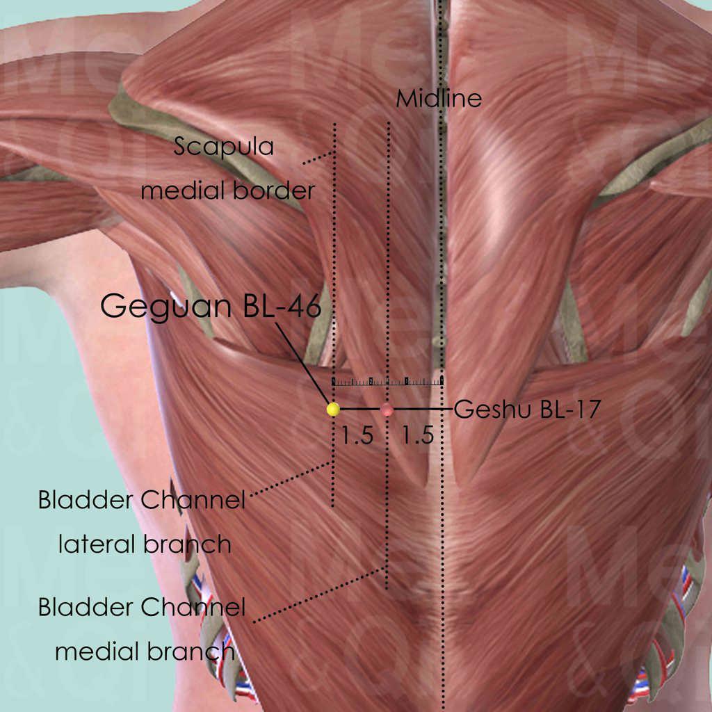 Guguan BL-46 is at the same level as Geshu BL-17, which is the Gathering-Hui point of the Blood. Therefore, it has many actions similar to BL-17.