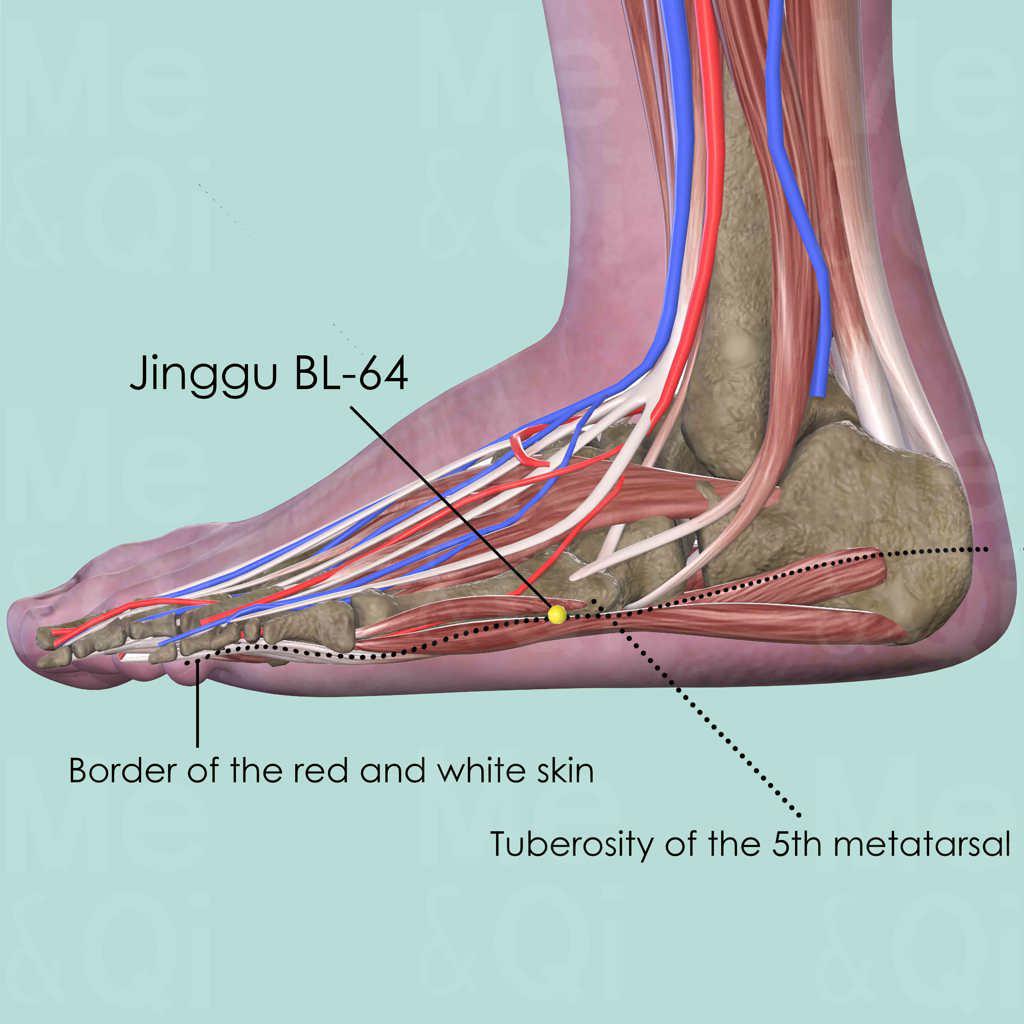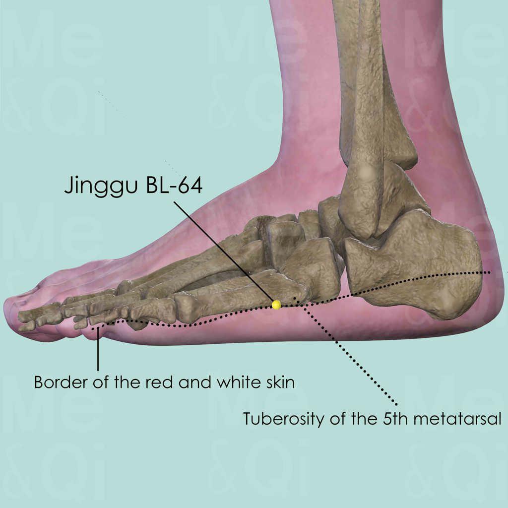 Palpating along the lateral aspect of the foot on the level of the border of the ‘red and white’ skin, a bony structure can be felt approximately at the midpoint of the foot. This is the tuberosity of the 5th metatarsal bone. Jinggu BL-64 is located directly distal to it towards the toes.