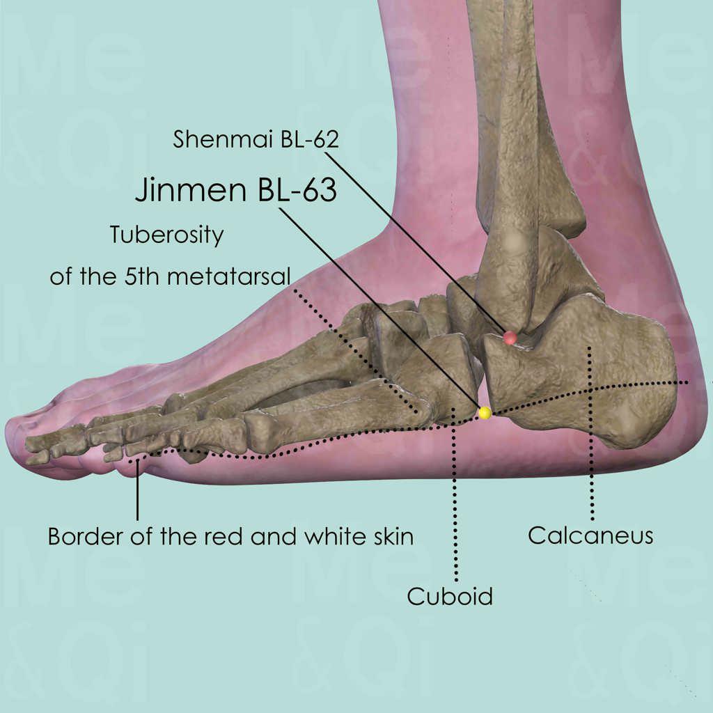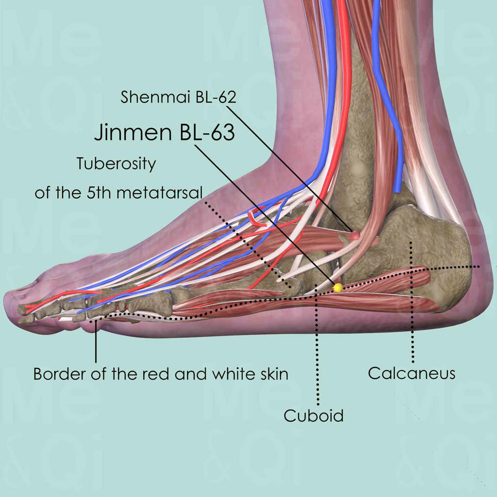 Palpate along the lateral aspect of the foot on the level of the border of the ‘red and white’ skin, a bony structure can be felt approximately at the midpoint of the foot. This is the tuberosity of the 5th metatarsal point. From there, palpate slightly towards the heel and locate Jinmen BL-63 in a depression between the calcaneus and the cuboid bone.