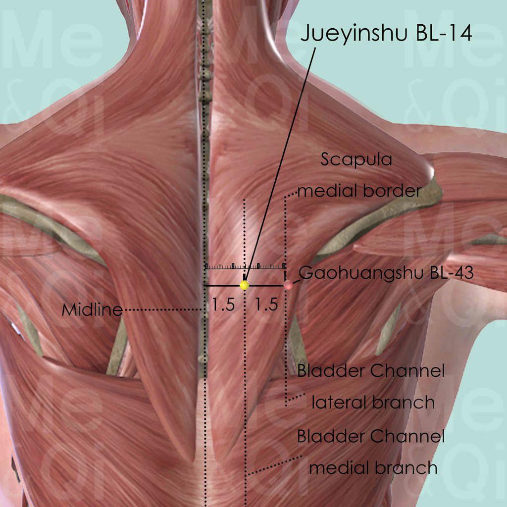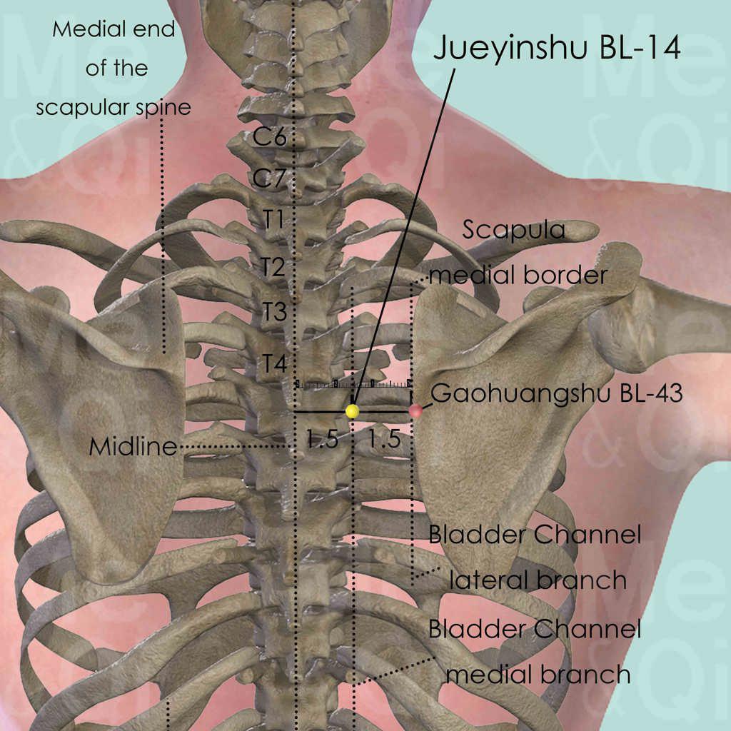 Jueyinshu BL-14 is an important point, widely used in various Heart disorders. It has a powerful effect on invigorating Qi on the chest and eliminating pain there. Typical diseases include arrhythmia, tachycardia, angina pectoris and coronary heart disease.