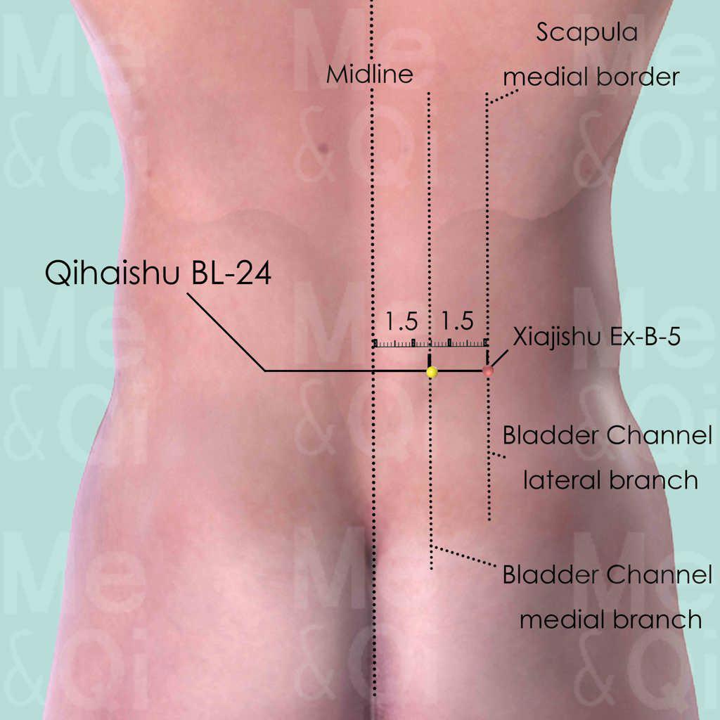 Despite that Qihaishu BL-24 is not a major point of the Bladder Channel, it is widely used as a local point for acute or chronic lower back pain or stiffness. It also eases leg pain due to Painful Obstruction Syndrome.