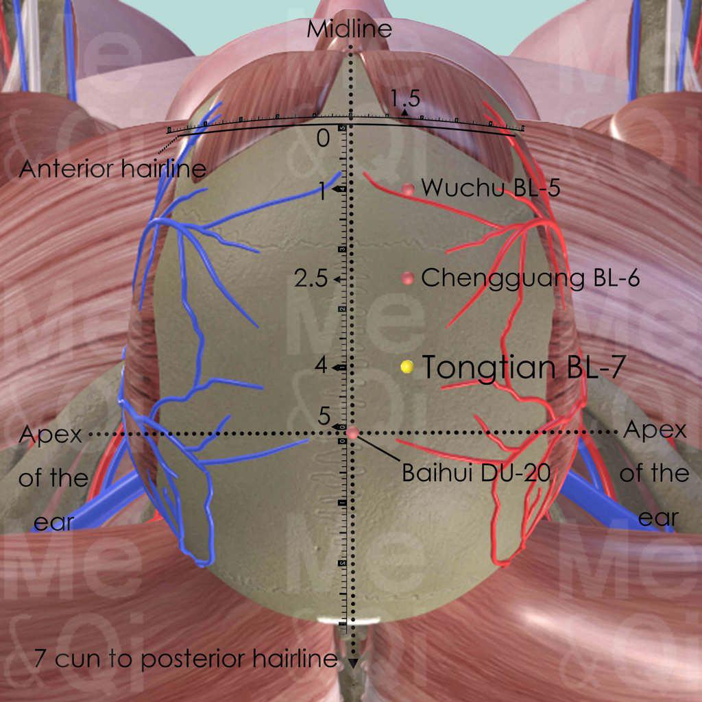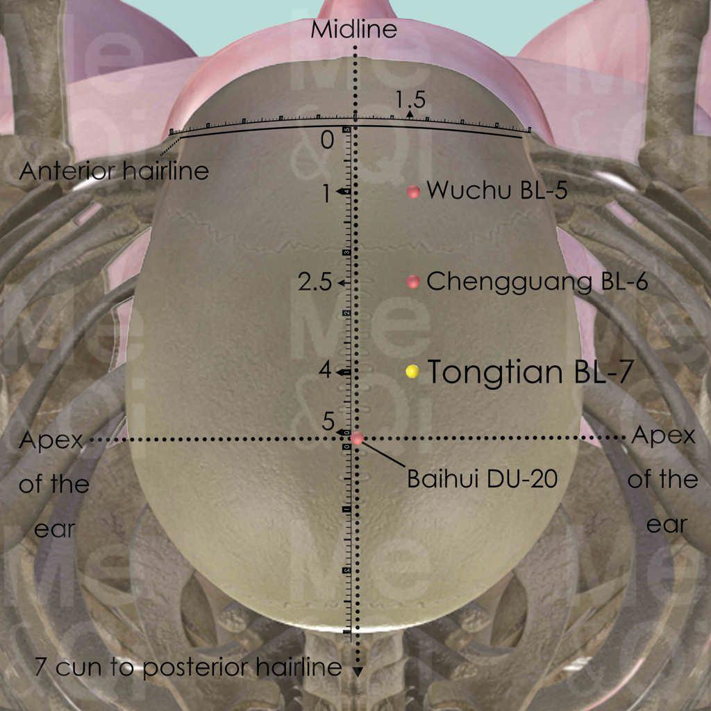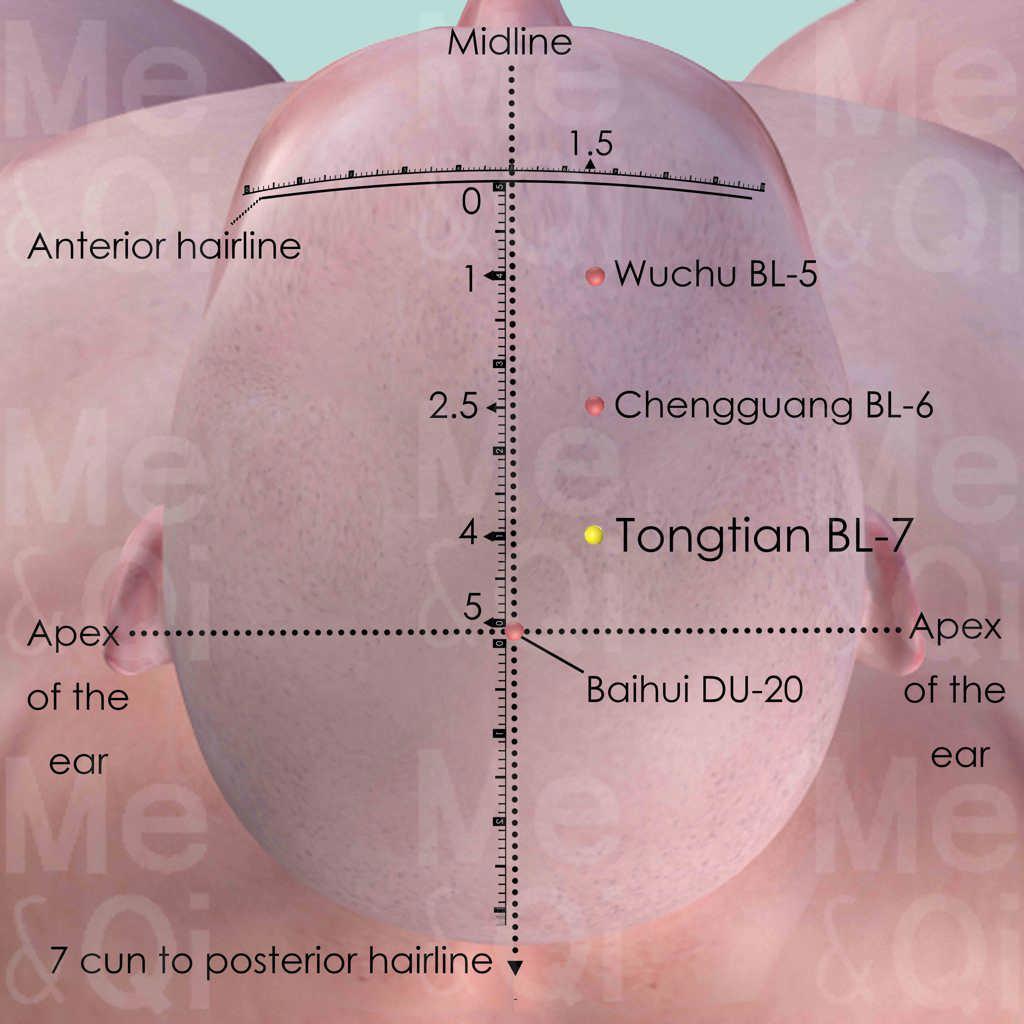 First identify Baihui DU-20 at the vertex, which is at the junction of the anterior midline and a line connecting the ear apices. Baihui DU-20 is 5 cun superior to the anterior hairline, while Tongtian BL-7 is 1 cun anterior to DU-20 and 1.5 cun lateral to the midline.