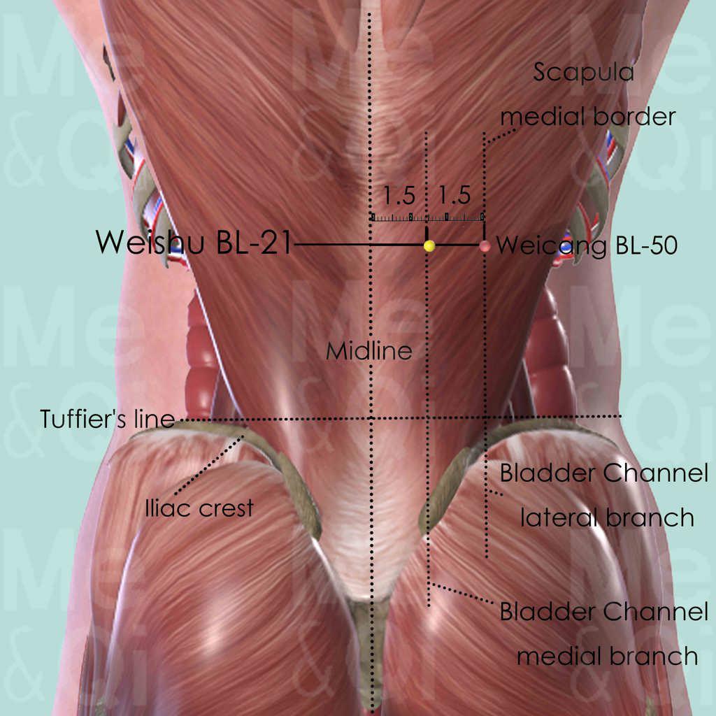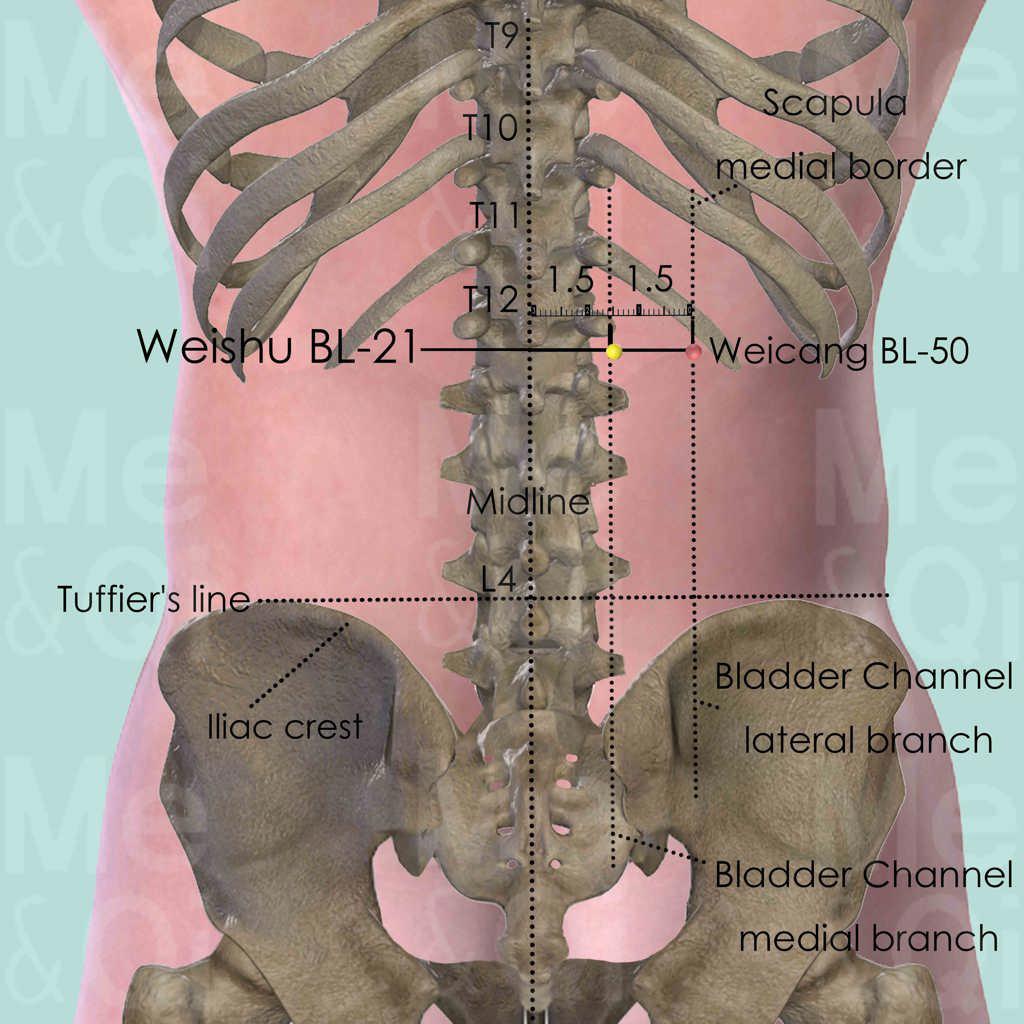 As the Back Transporting-Shu point of the Stomach, Weishu BL-21 is an important point with various functions related to the Stomach.