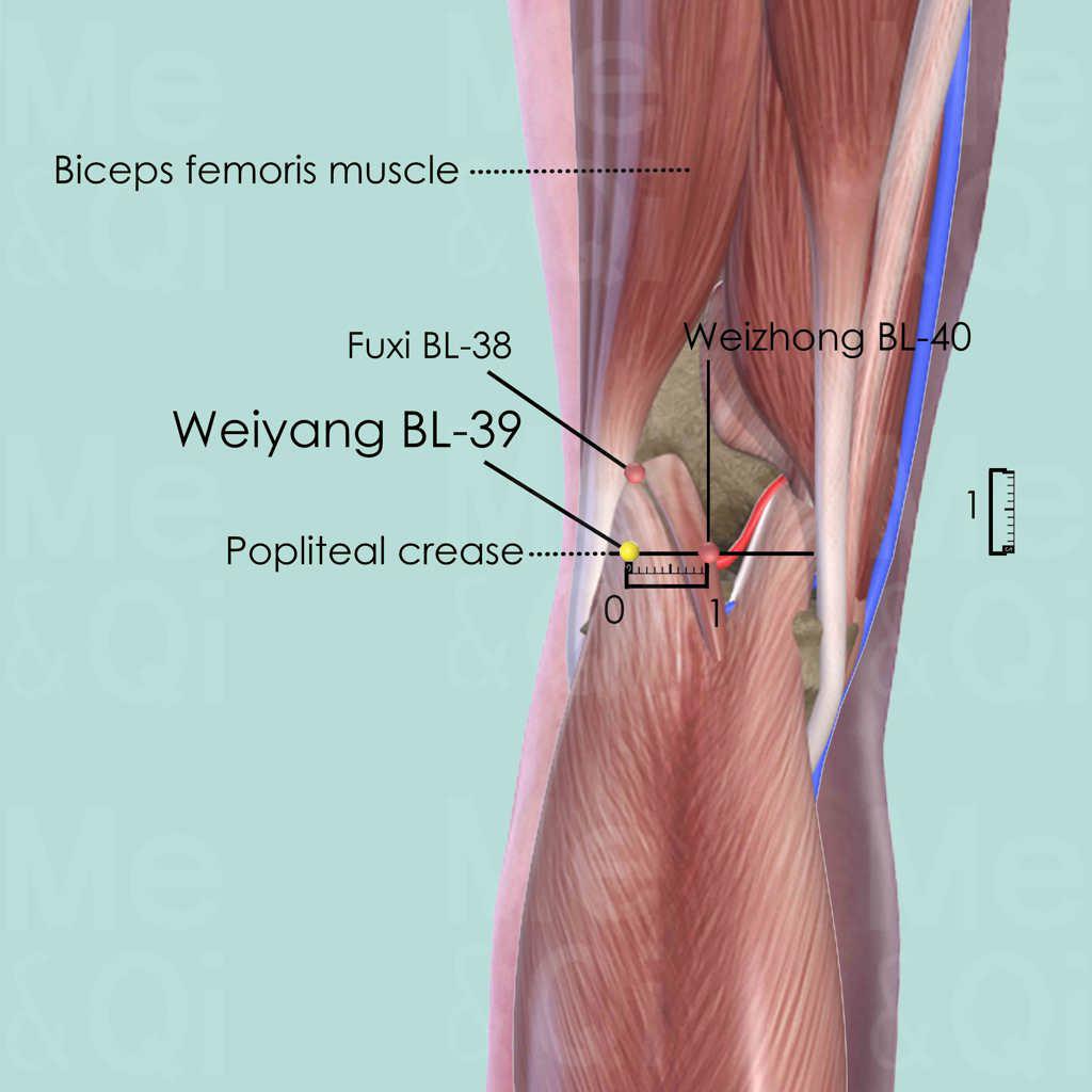 First flex the knee slightly in order to reveal the popliteal crease. Then identify Weizhong BL-40 in the middle of the popliteal crease. Weiyang BL-39 is about 1 cun lateral to BL-40, in a depression medial to the tendon of the long head of the beceps femoris muscle.
