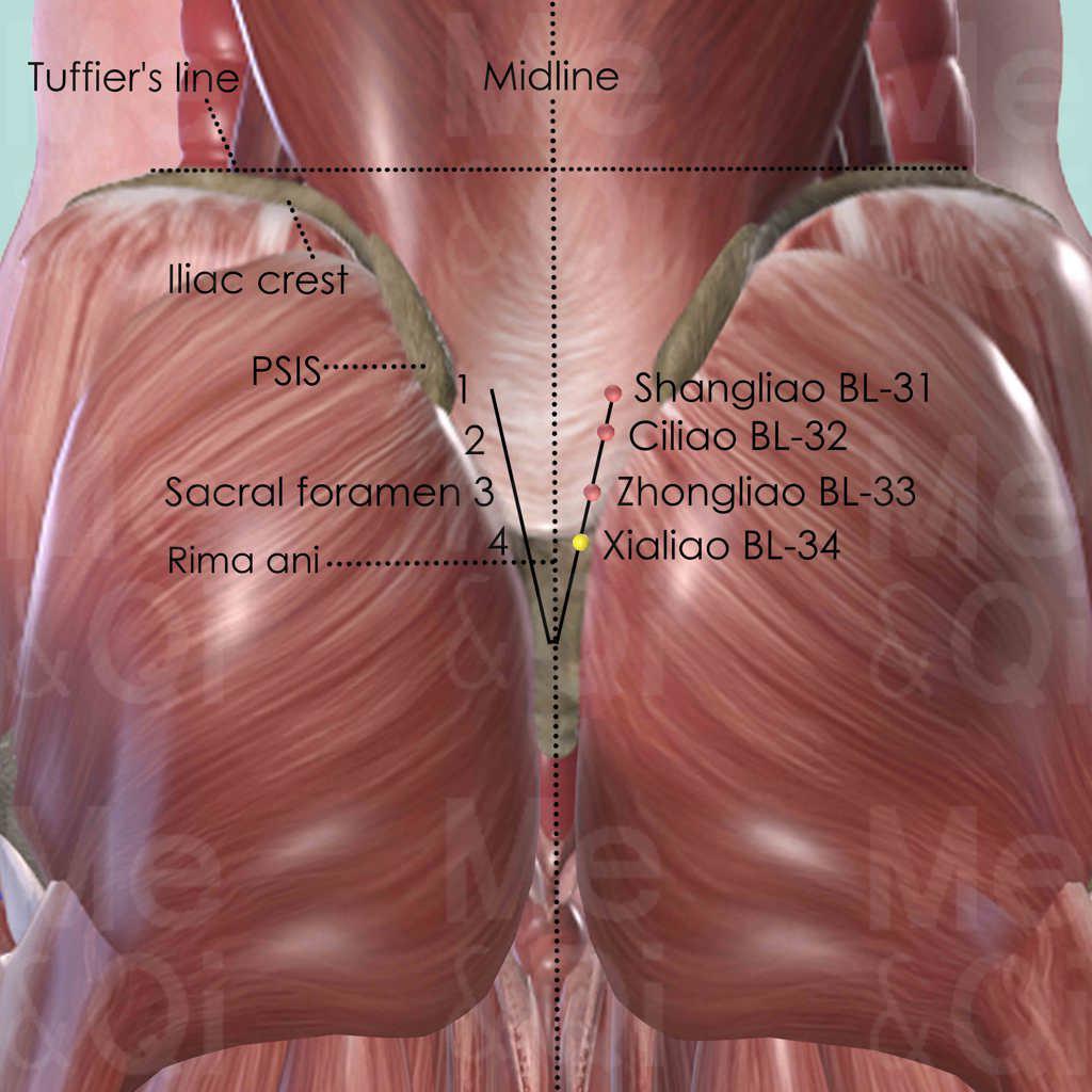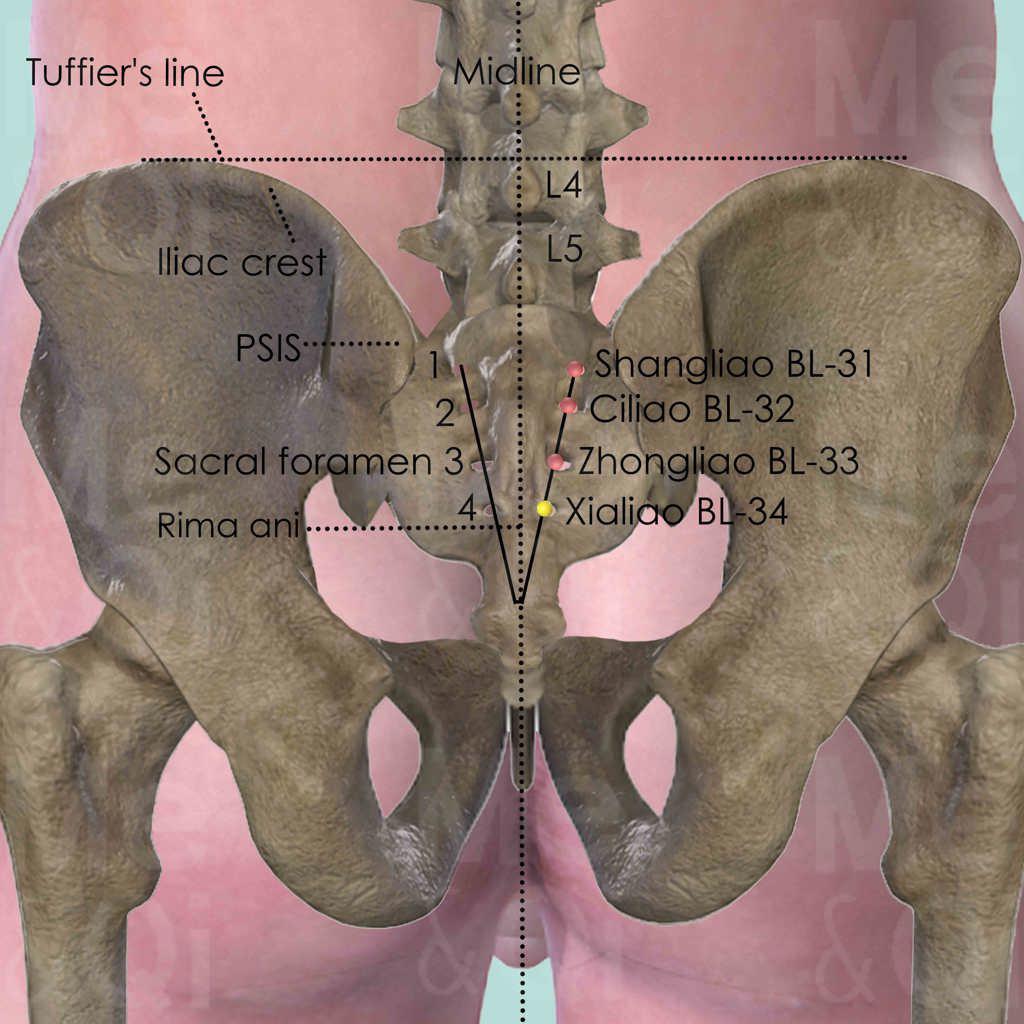 Shangliao BL-31 (Upper crevice) is at the highest sacral foramina. Ciliao BL-32 (Second crevice) is at the second. Zhongliao BL-33 (Middle crevice) the third, while Xialiao BL-34 (Lower crevice) is the last one.