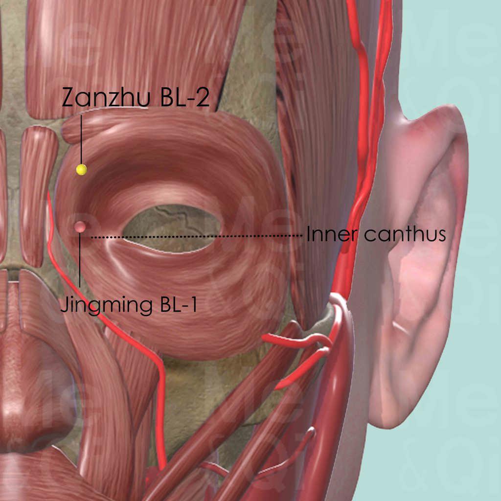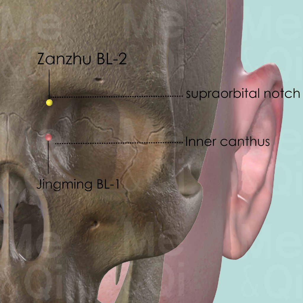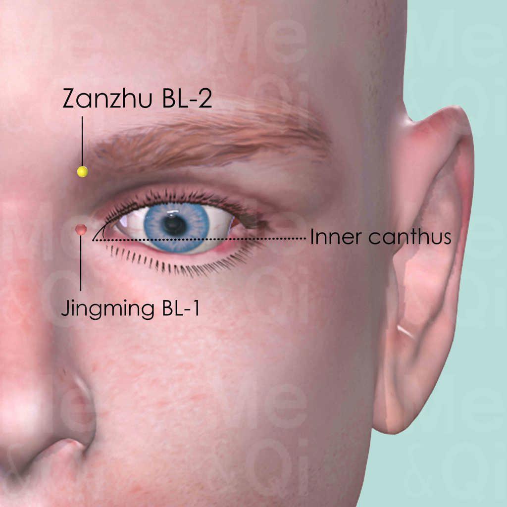 First identify Jingming BL-1 which is 0.1 cun superior to the inner canthus. Zanzhu BL-2 is directly above BL-1 in a depression at the medial end of the eyebrow. This point is generally pressure-sensitive.