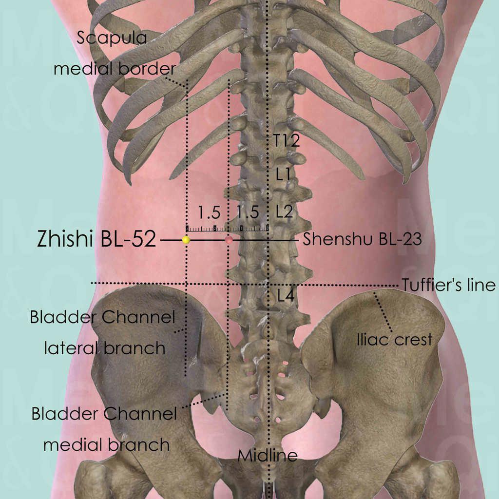 Zhishi BL-52 is at the same level as Shenshu BL-23, which is the Back-Transporting-Shu point of the Kidneys. Therefore it shares many functions as BL-23 and strengthens the effect when the two points are used together.