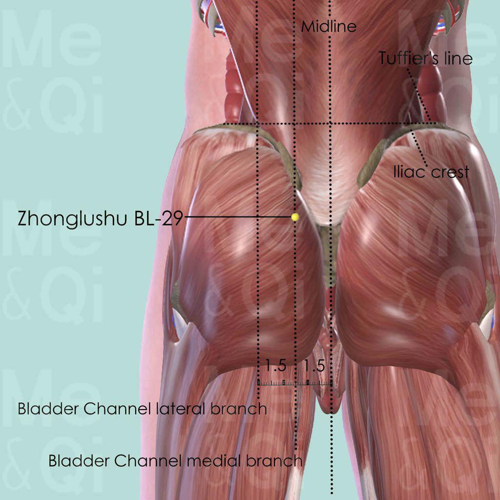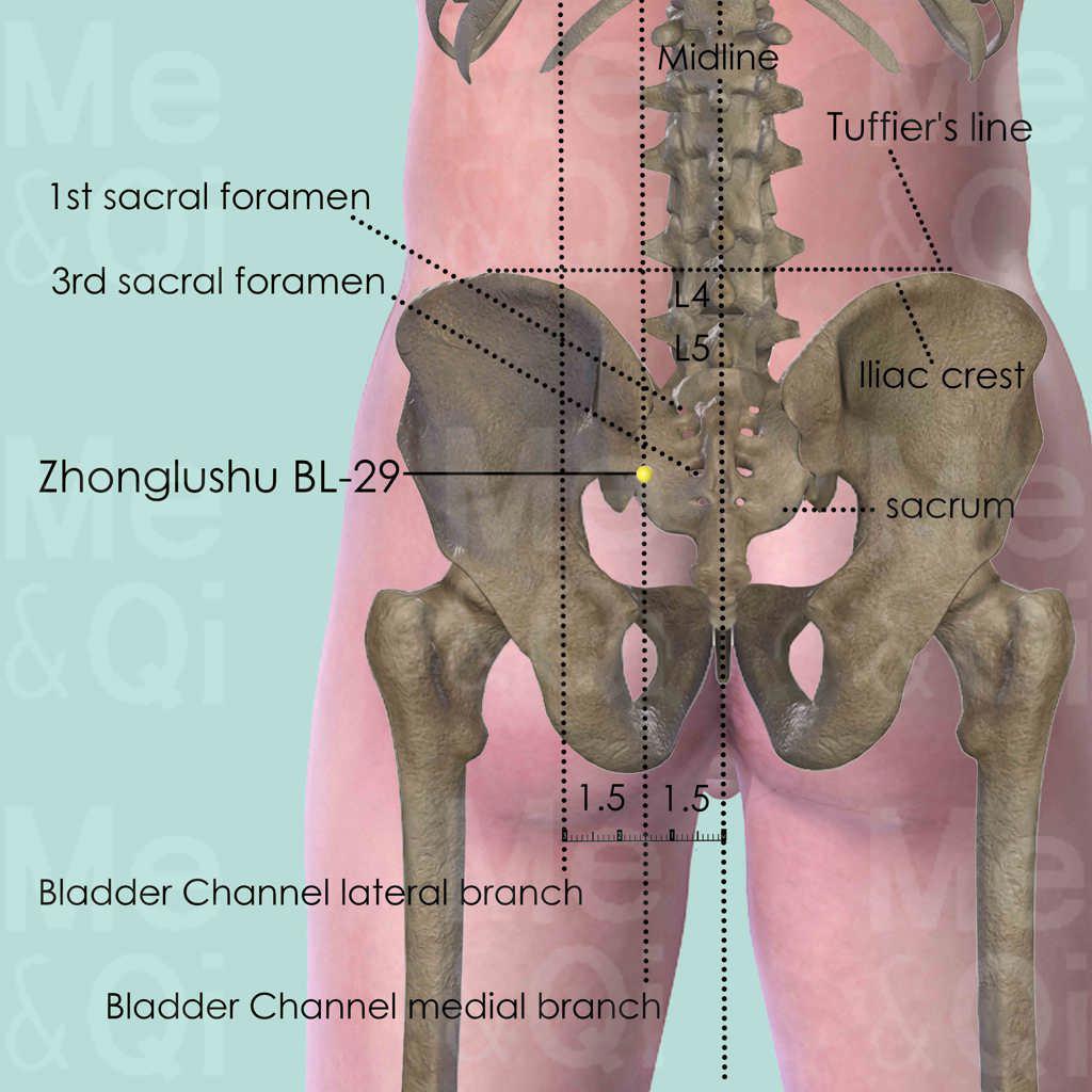 First identify the Tuffier's line which connects the highest points of the iliac crest. The spinous process of the 4th lumber vertebra (L4) mostly falls on this line. Then palpate in an inferior direction, passing L5, and reach the most superior 1st sacral foramen. Palpate further down for two sacral foramens and locate the 3rd one in a depression. Locate Zhonglushu BL-29 at the same level of the 3rd sacral foramen and 1.5 cun lateral to the posterior midline. Points located between Fufen BL-41 and Zhibian BL-54 are in the lateral branch of the Bladder Channel, while these between Fengmen BL-12 and Baihuanshu BL-30 are in the medial branch.