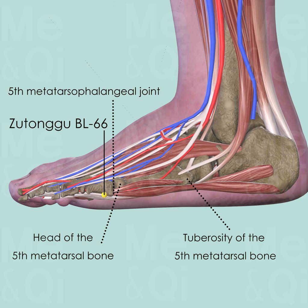 Palpate along the bony structures on the lateral aspect of the foot, a prominent bony landmark can be felt approximately at the midpoint of the foot. This is the tuberosity of the 5th metatarsal bone. Palpate from there towards the toes, a further bony structure can be felt, which is the head of the 5th metatarsal bone. Locate Zutonggu BL-66 distal to the 5th metatarsal bone, in a depression distal and inferior to the 5th metatarsophalangeal joint