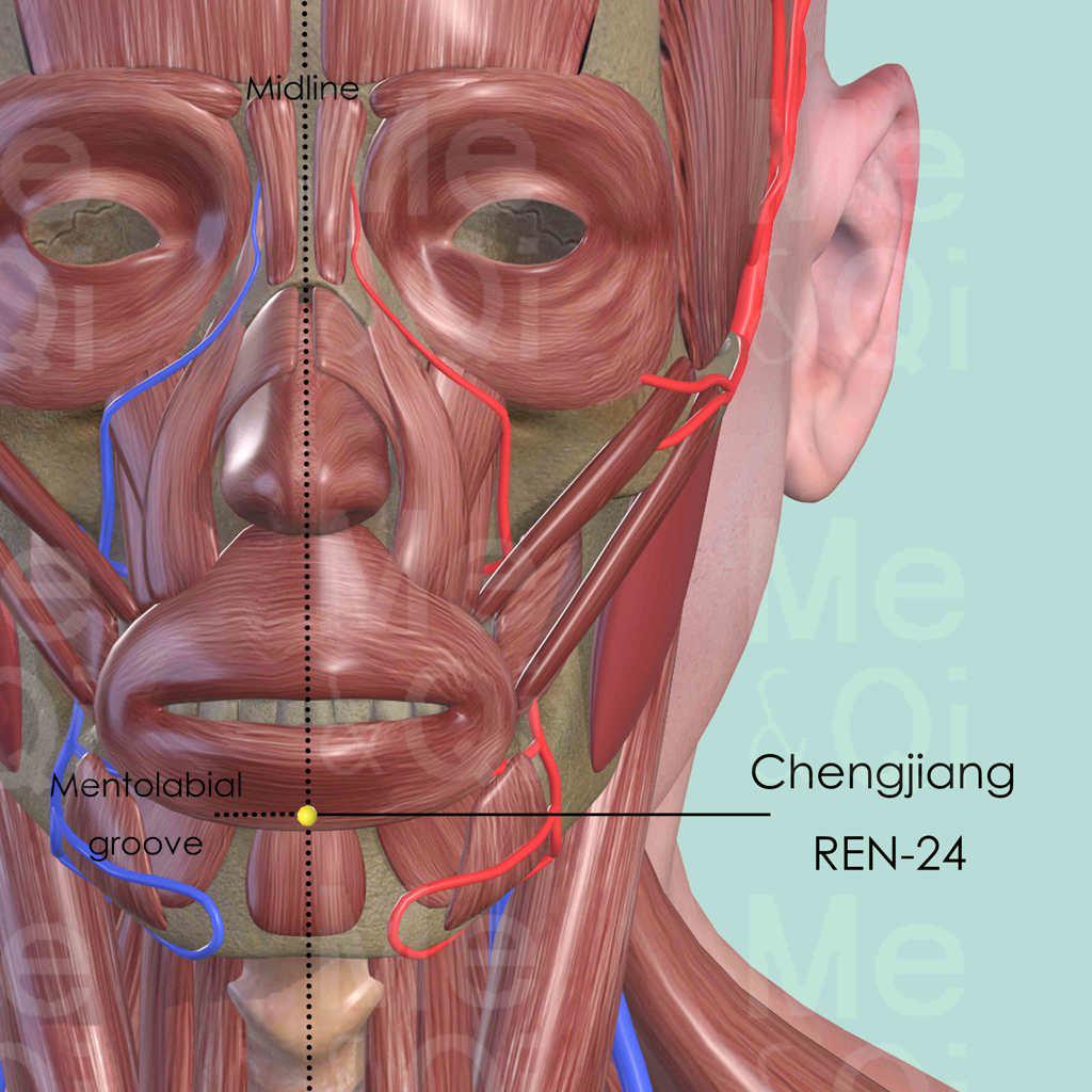 Locate Chengjiang REN-24 in the center of the depression of the mentolabial groove.