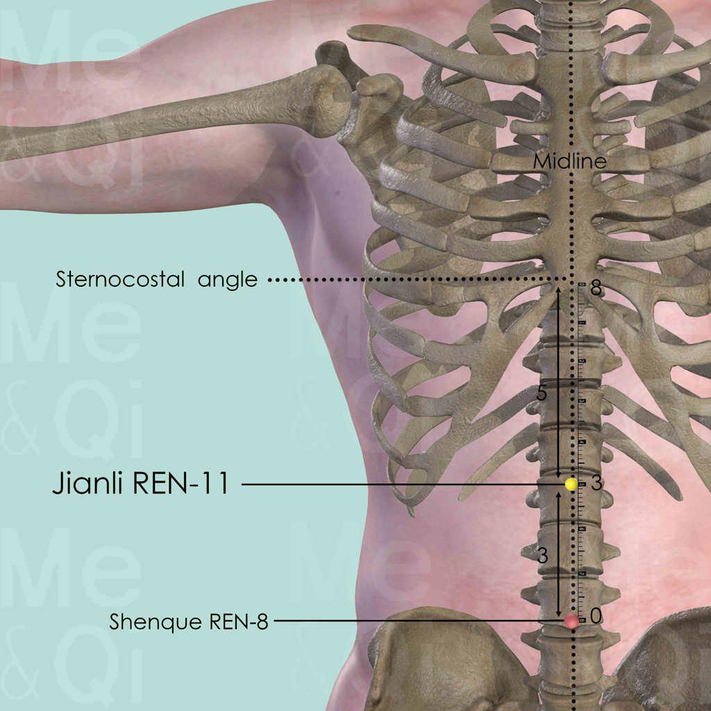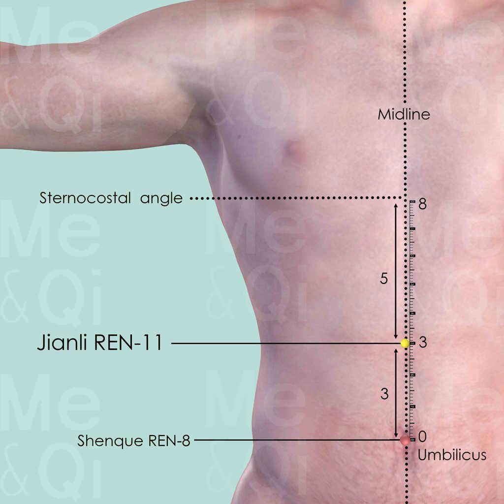On the midline of the abdomen, divide the distance between the umbilicus and the sternocostal angle into 8 cun. Jianli REN-11 is located 3 cun above umbilicus.