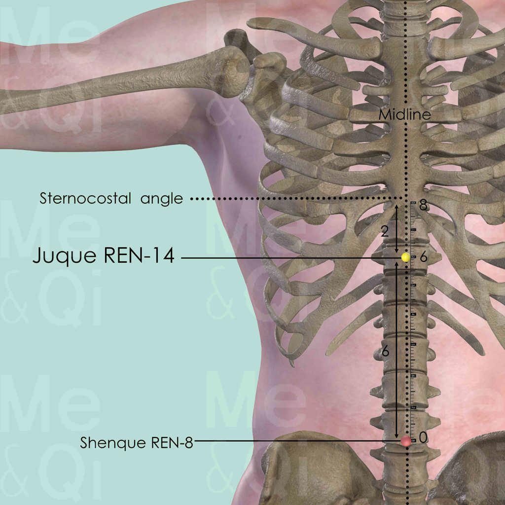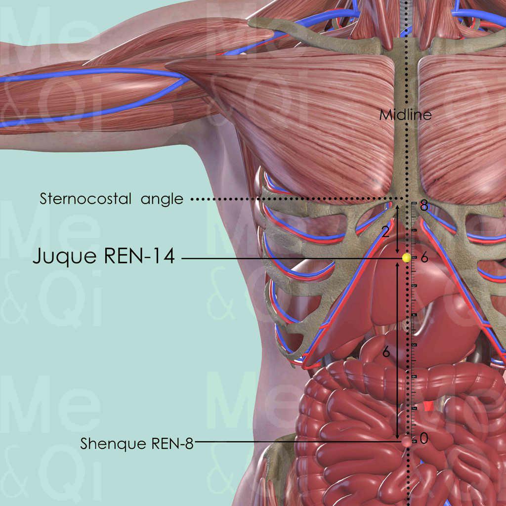 Juque REN-14 treats both Stomach and Heart disorders in subduing their Rebellious Qi so as to treat symptoms such as nausea or vomiting. It is especially the case if the Rebellious Qi derives from emotional stress.