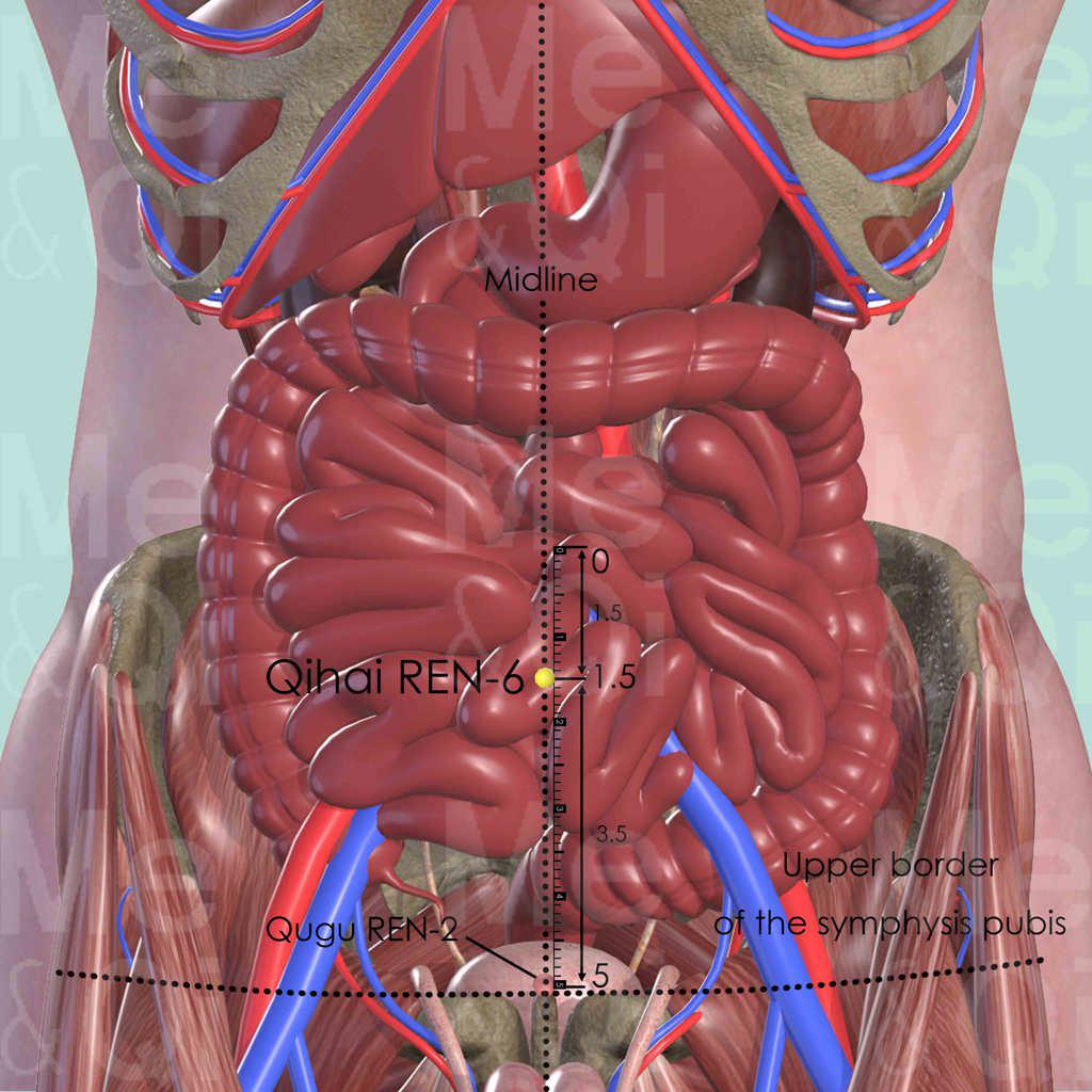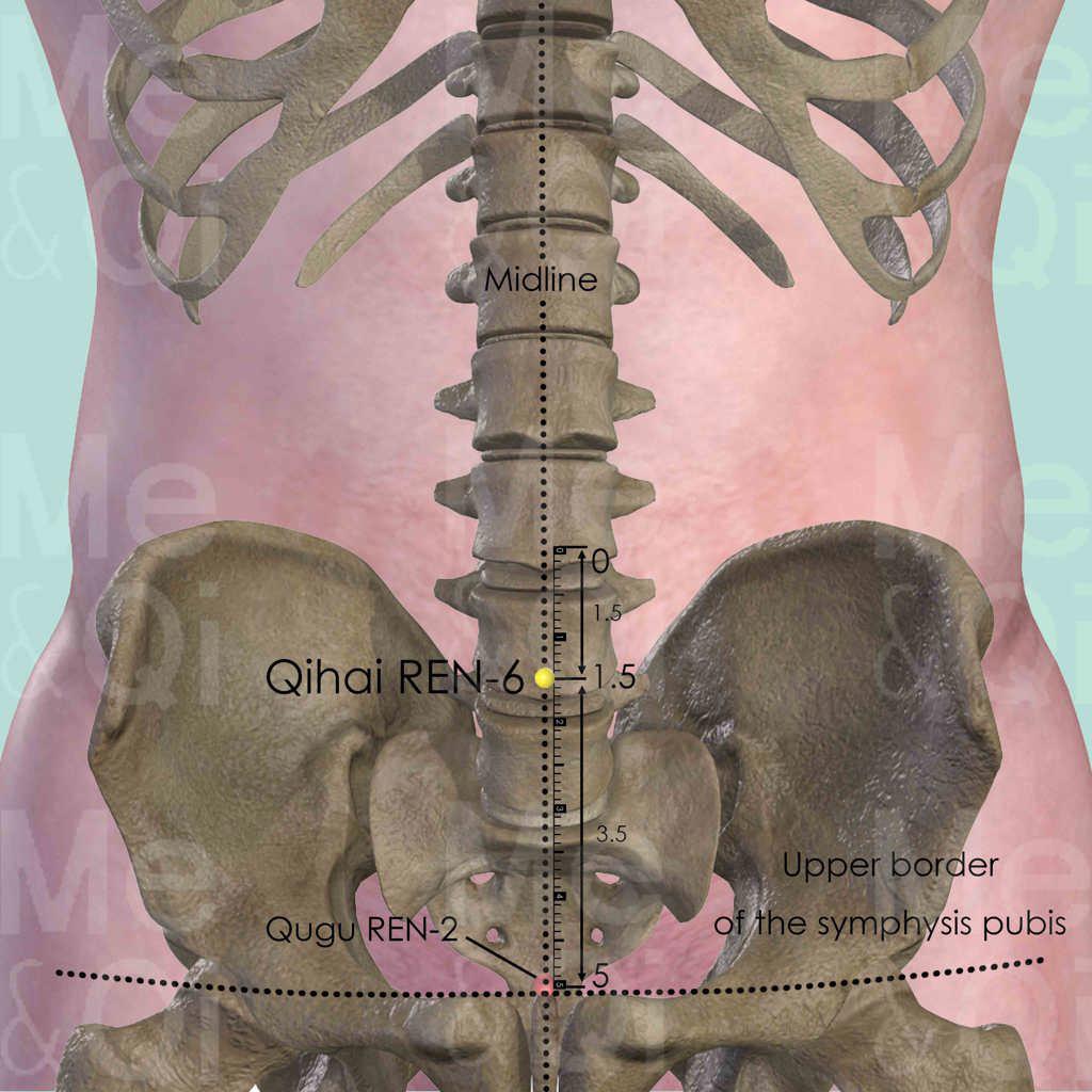 On the midline of the lower abdomen, divide the distance between the umbilicus and the upper border of the pubic symphysis into 5 cun. Qihai REN-6 is located 1.5 cun below umbilicus and 3.5 cun above the upper border of the pubic symphysis.