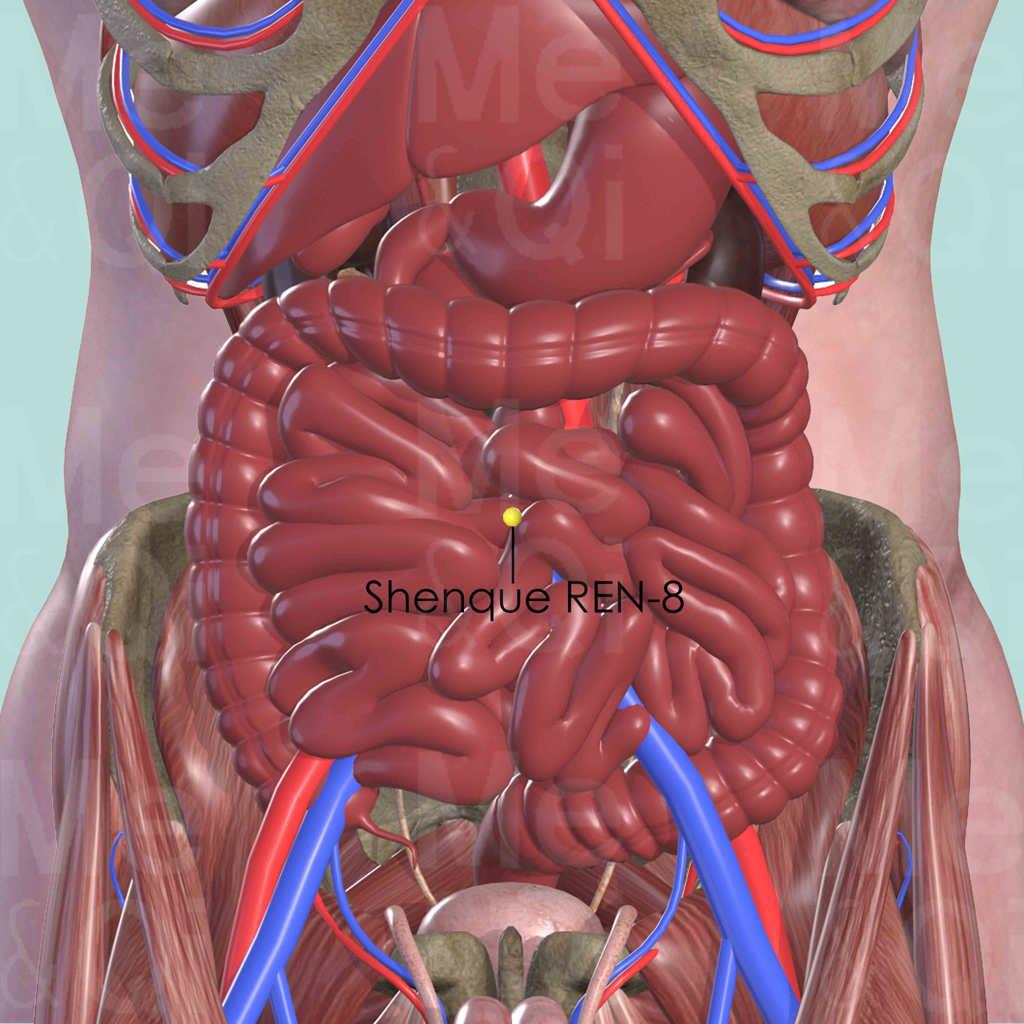 The 'Great Dictionary of Chinese Acupuncture’ comments on this point: Shenque Ren-8 is the abode of the Spirit (Shen 神). Above it there is Heaven (Shuifen REN-9 and Xiawan REN-10), Below it there is Earth (Guanyuan REN-4 and Zhongji REN-3), In the middle there is Person (REN-8 itself). On both sides there is Qixue KI-13 and Huangshu KI-16, which are like guarding watchtowers.