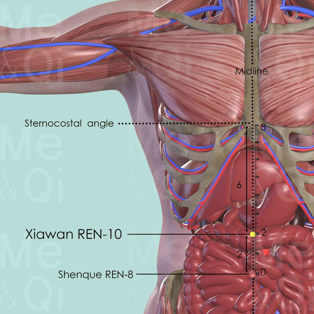 On the midline of the abdomen, divide the distance between the umbilicus and the sternocostal angle into 8 cun. Xiawan REN-10 is located 2 cun above umbilicus.