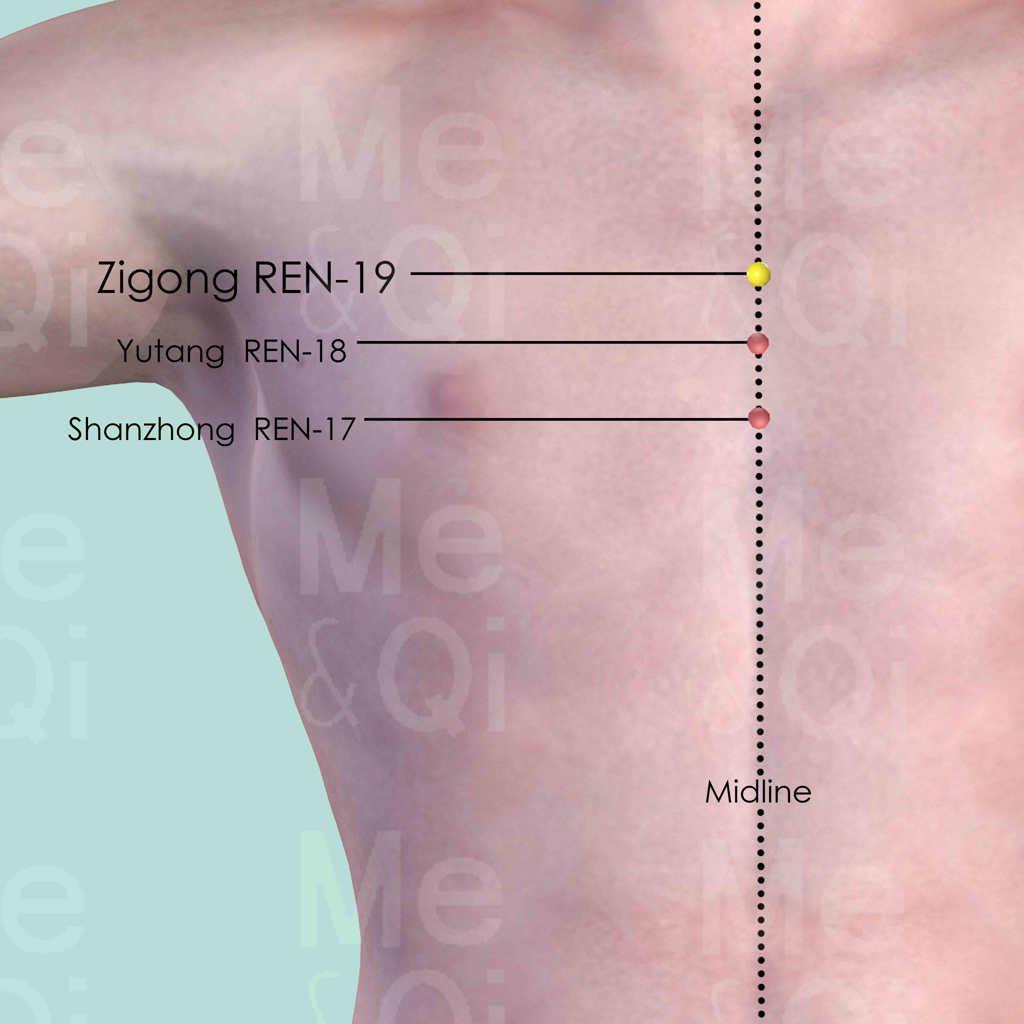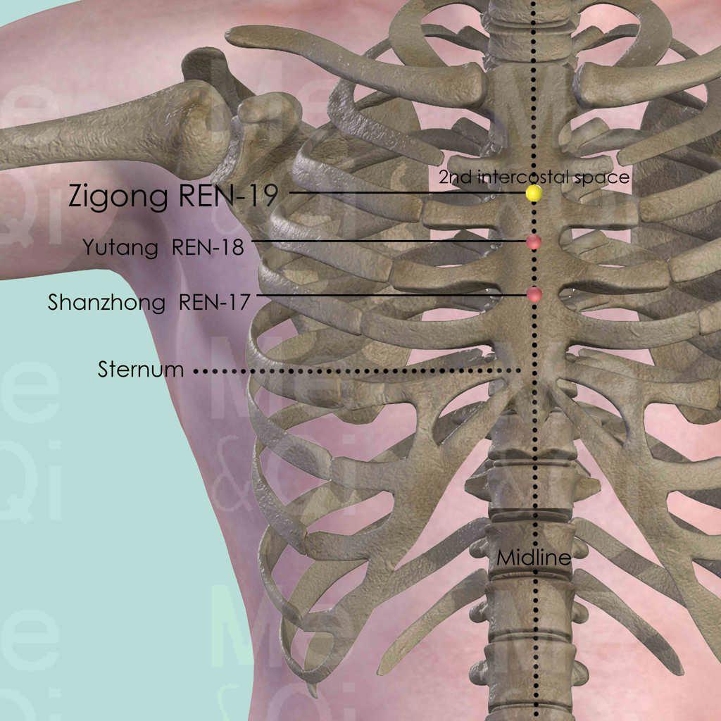 Identify Shangzhong REN-17 in the middle of the two nipples, on the level of the 4th intercostal space. Locate the 2nd intercostal space by counting two space up. Or locate the 2nd intercostal space by palpation or counting down from the clavicle. Zigong REN-19 is on the midline of the sternum.