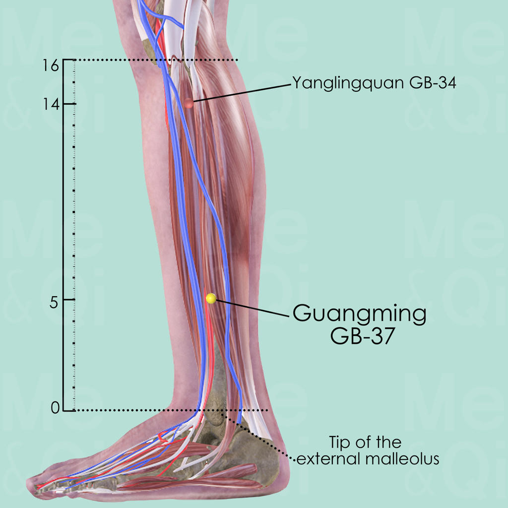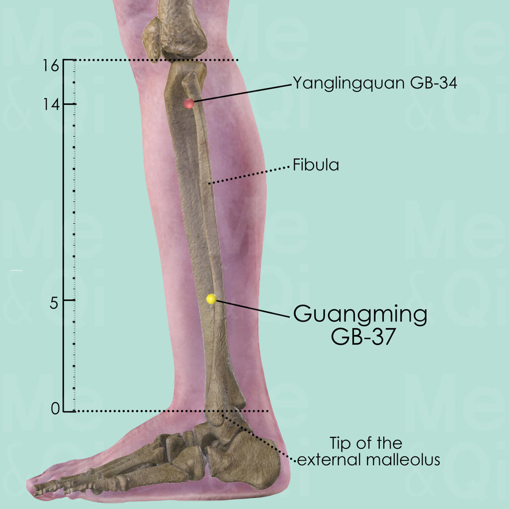 First locate Yanglingquan GB-34 in the depression anterior and inferior to the head of the fibula. Then locate the highest prominence of the lateral malleolus. Identify the midpoint of these two reference points and measure 2 cun in a distal direction. Locate Guangming GB-37 in a depression in this level on the anterior border of the fibula. GB-37 is about 5 cun above the tip of the lateral malleolus.