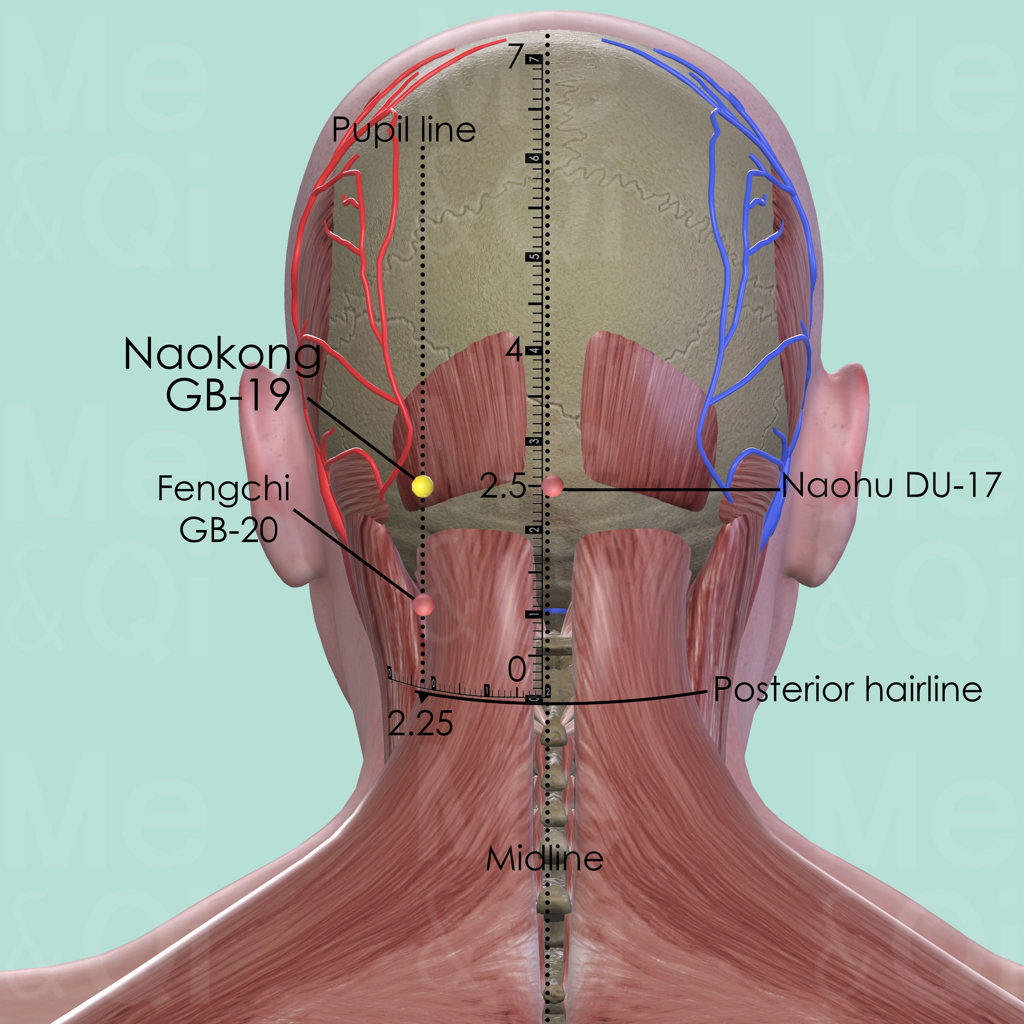 Like almost all Gall Bladder Channel points in the head, Naokong GB-19 subdues Liver Yang, characterized by headache and dizziness. On top of that, it has other functions such as clearing Heat in the head and Gall Bladder Channel.