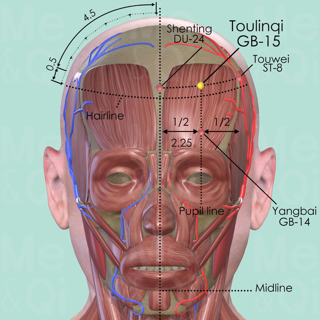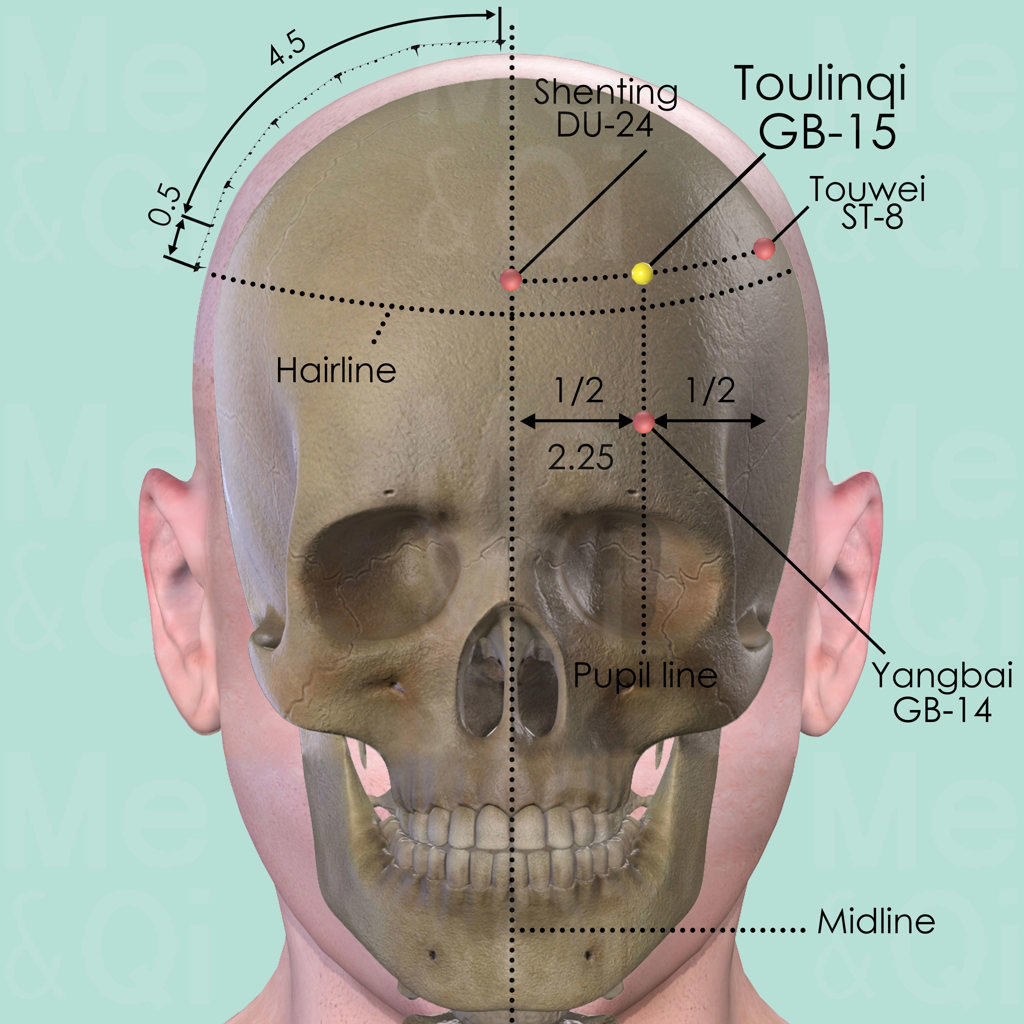 With the patient looking straight ahead, Toulingqi GB-15 is located on the pupil line and 0.5 cun superior to the anterior hairline. Pupil line is 2.25 cun lateral to the anterior midline. Or: Draw an imaginary line between Shenting DU-24 and Touwei ST-8. Divide the line into two and locate Touingqi GB-15 in the midway.