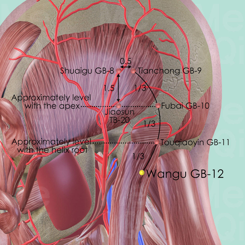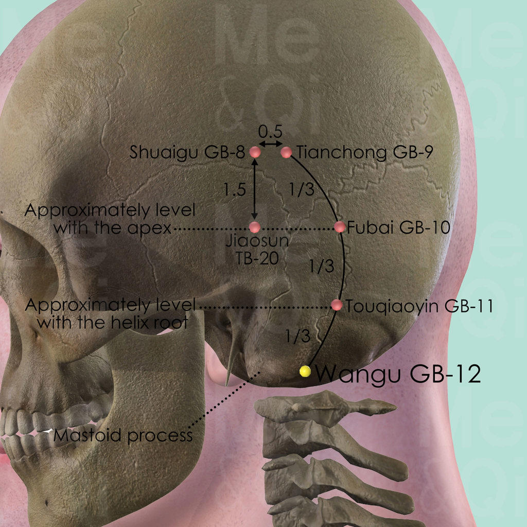 Palpate the junction of the cranium and the neck and identify the mastoid process as a cone-shaped, boney structure. Locate Wangu GB-12 in the inferior aspect of the mastoid process on the lower border posterior to the tip of the process. Both Tianchong GB-9 and Wangu GB-12 are reference points for locating Fubai GB-10 and Touqiaoyin GB-11.