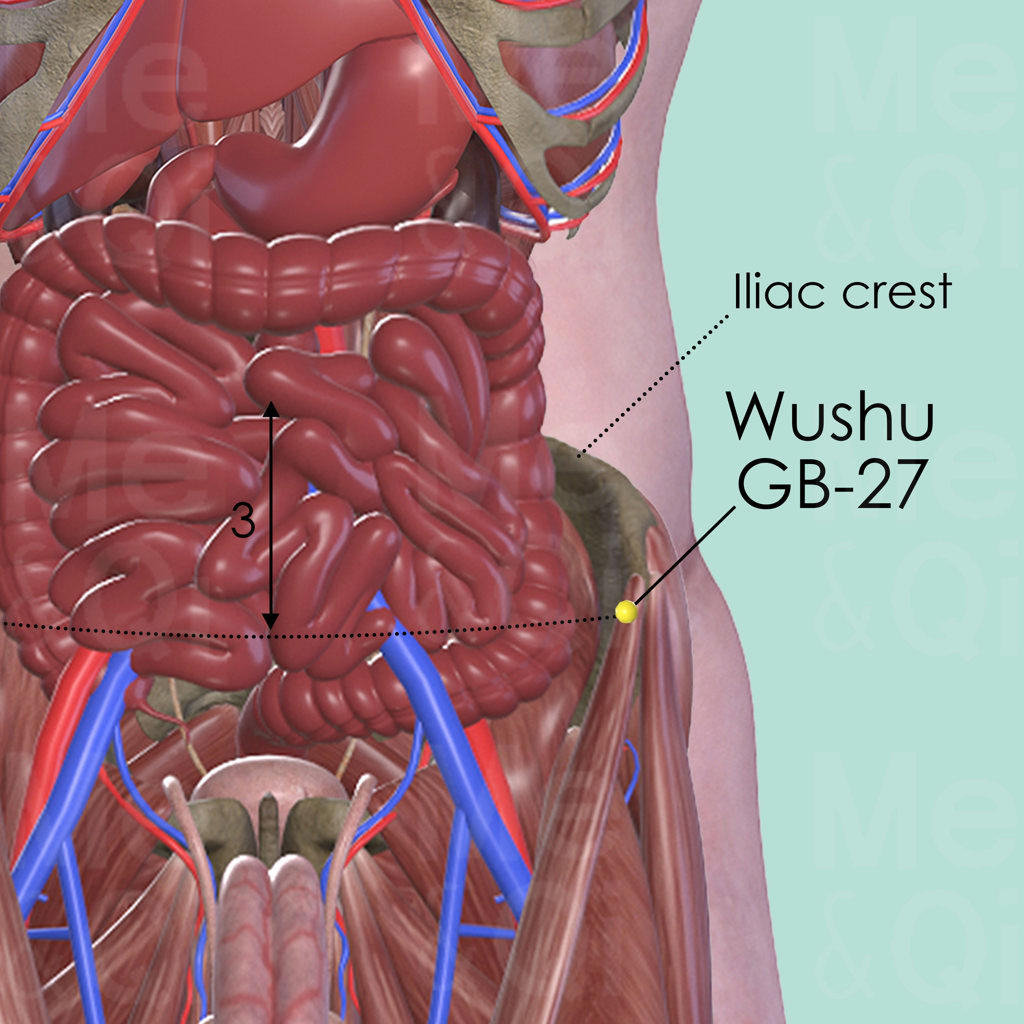 First palpate along the upper border of the iliac crest in an anterior and inferior direction so as to identify ASIS (anterior superior iliac spine). ASIS is a bony ridge on the lateral aspect of the lower abdomen. Wushu GB-27 is in a depression medial and anterior to the ASIS.