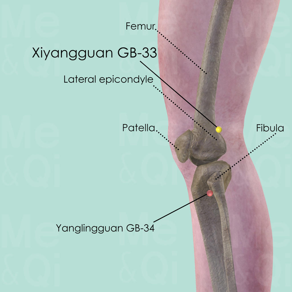 When the knee is flexed, Xiyangguan GB-33 is above Yanglingguan GB-34, in the depression between the shaft of the lateral epicondyle and the tendon of the biceps femoris muscle.