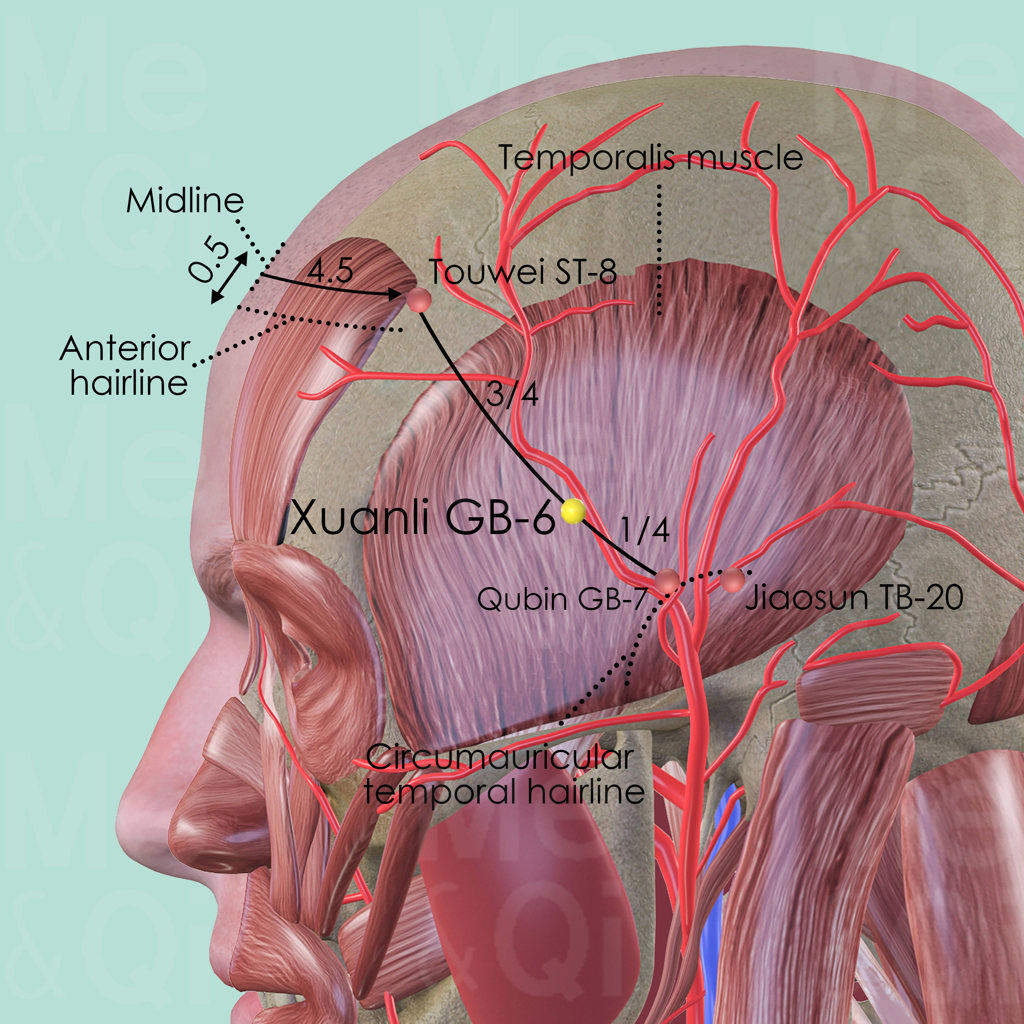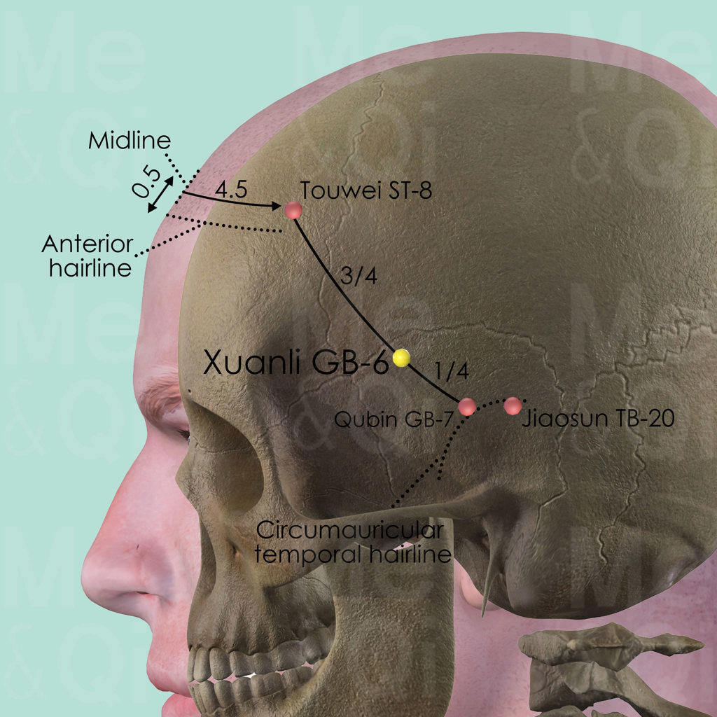 Xuanli GB-6 is a major local point indicated for migraine headaches caused by Liver Yang Rising, Liver Fire or Liver Wind. Typical other symptoms are dizziness or blurred vision.