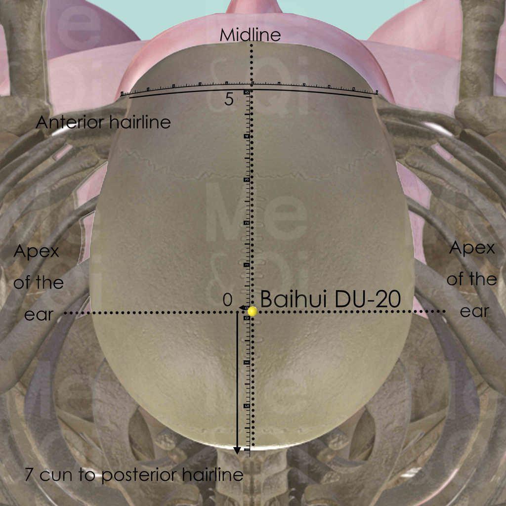 Baihui DU-20 is located at the vertex of the head. This is where the body's energy is able to reach its maximum potential. It also happens to be the point many Yang Channels passes, thus it has a dual function at either subduing Excessive Yang from the head or raising Deficient or Sinking Yang to the head.