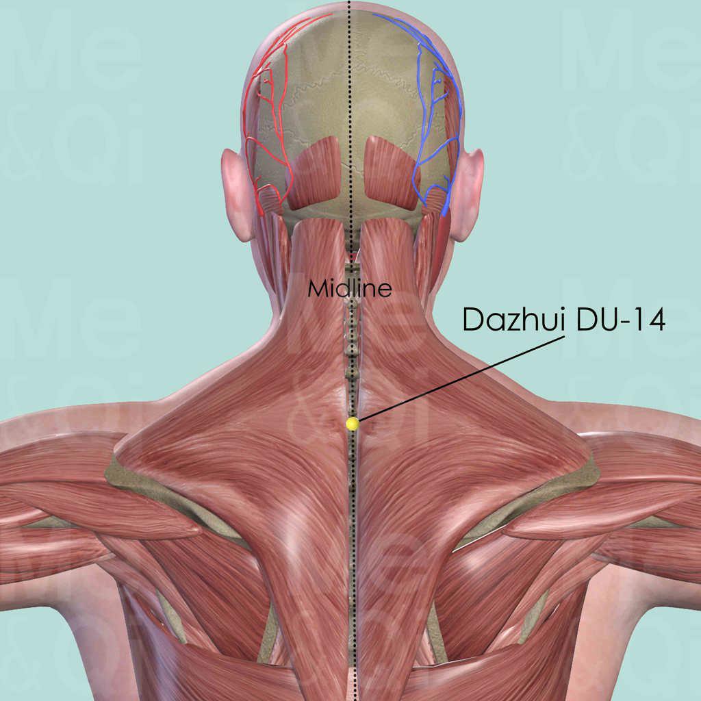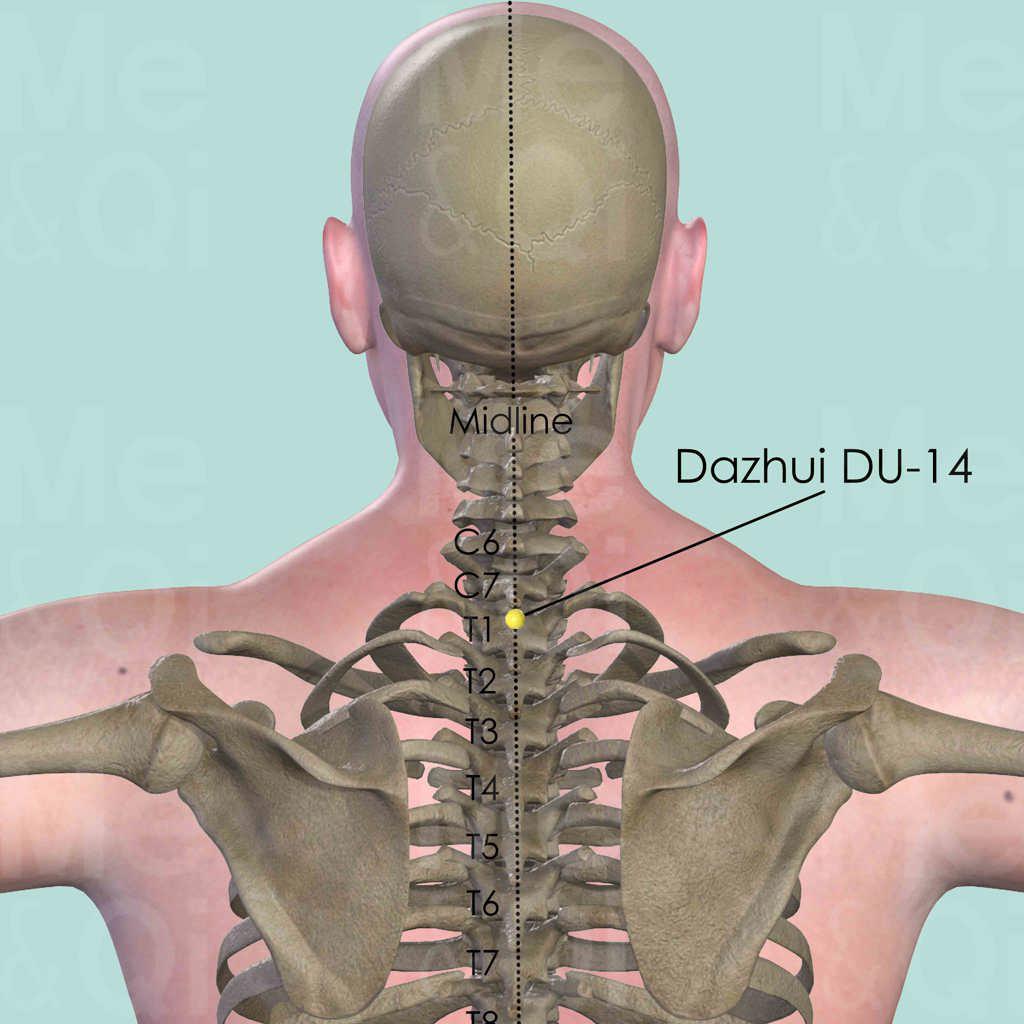 Firstly locate C6 by running the finger down the neck along the midline as it is the first palpable cervical vertebral spinous process. It becomes impalpable when the patients extend their neck. C7 is below C6 and it is still palpable despite that the neck is extended. Dazhui DU-14 is in the depression below C7.