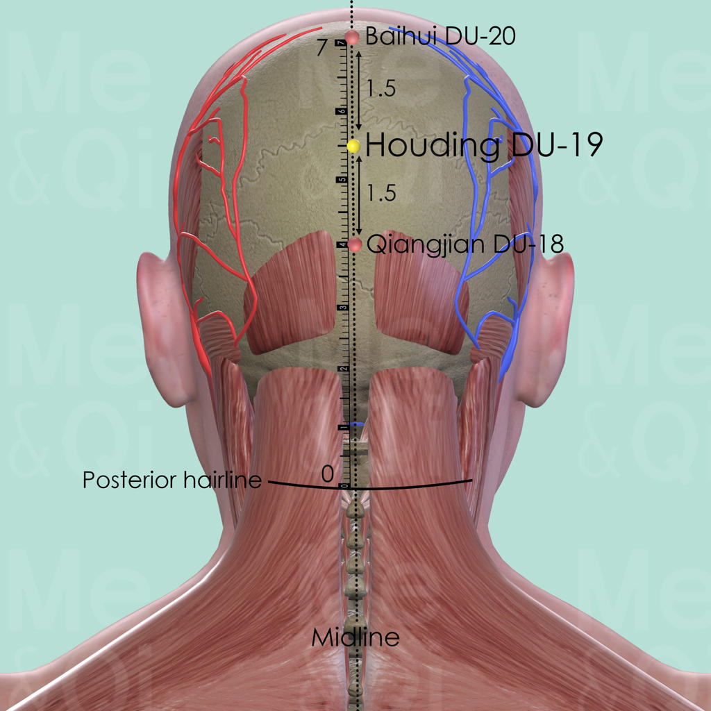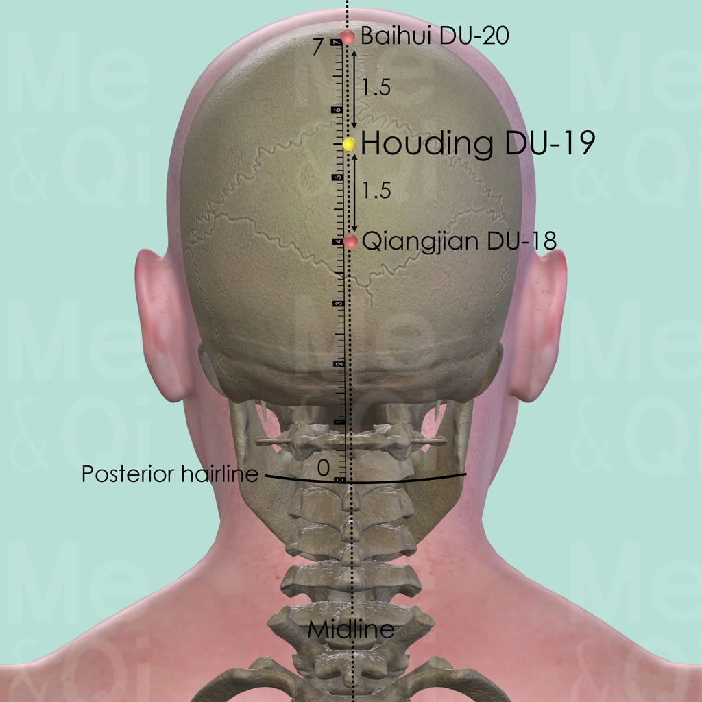 First use Baihui DU-20 located at the vertex as a reference point. Then palpate 1.5 cun in a posterior direction and locate Houding DU-19.