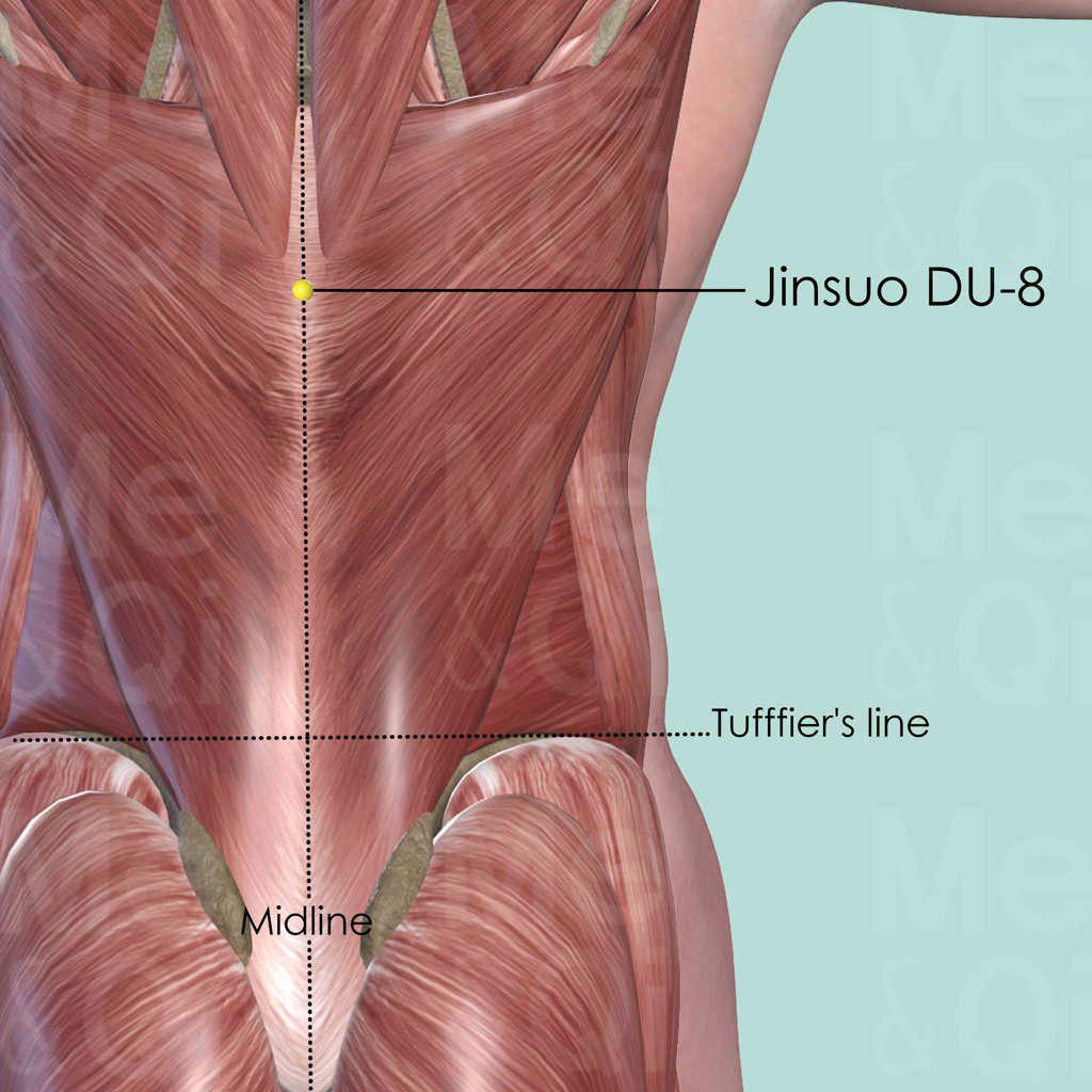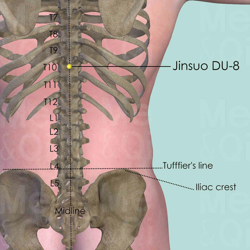 Locate the Tufffier's line, which connects the two most superior points on the iliac crest. It generally intersects with the spinous process of the 4th lumbar vertebra (L4). Then locate the 9th thoracic vertebra by counting up 7. Locate Jinsuo DU-8 below the spinous process of the 9th thoracic vertebra (T9) on the midline.