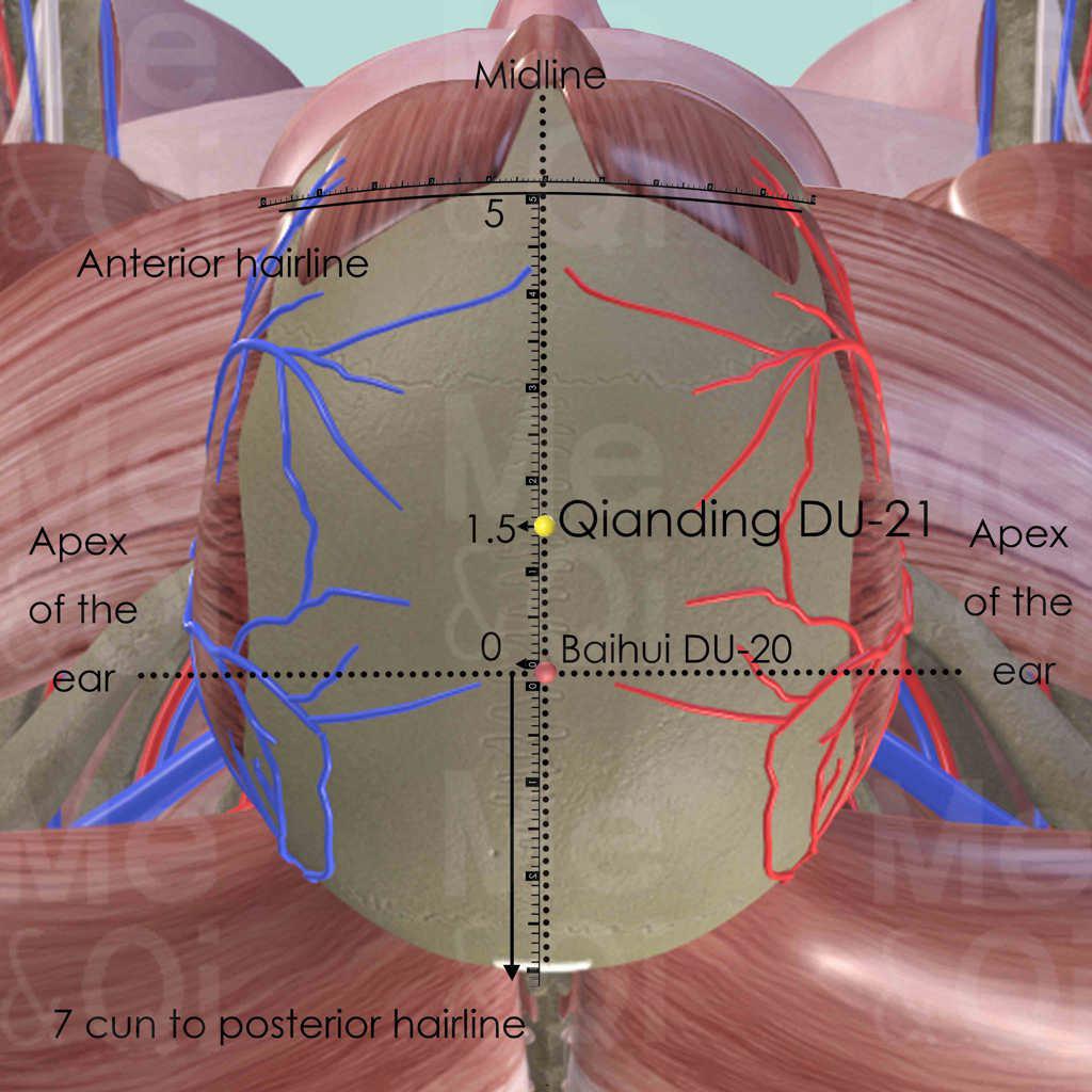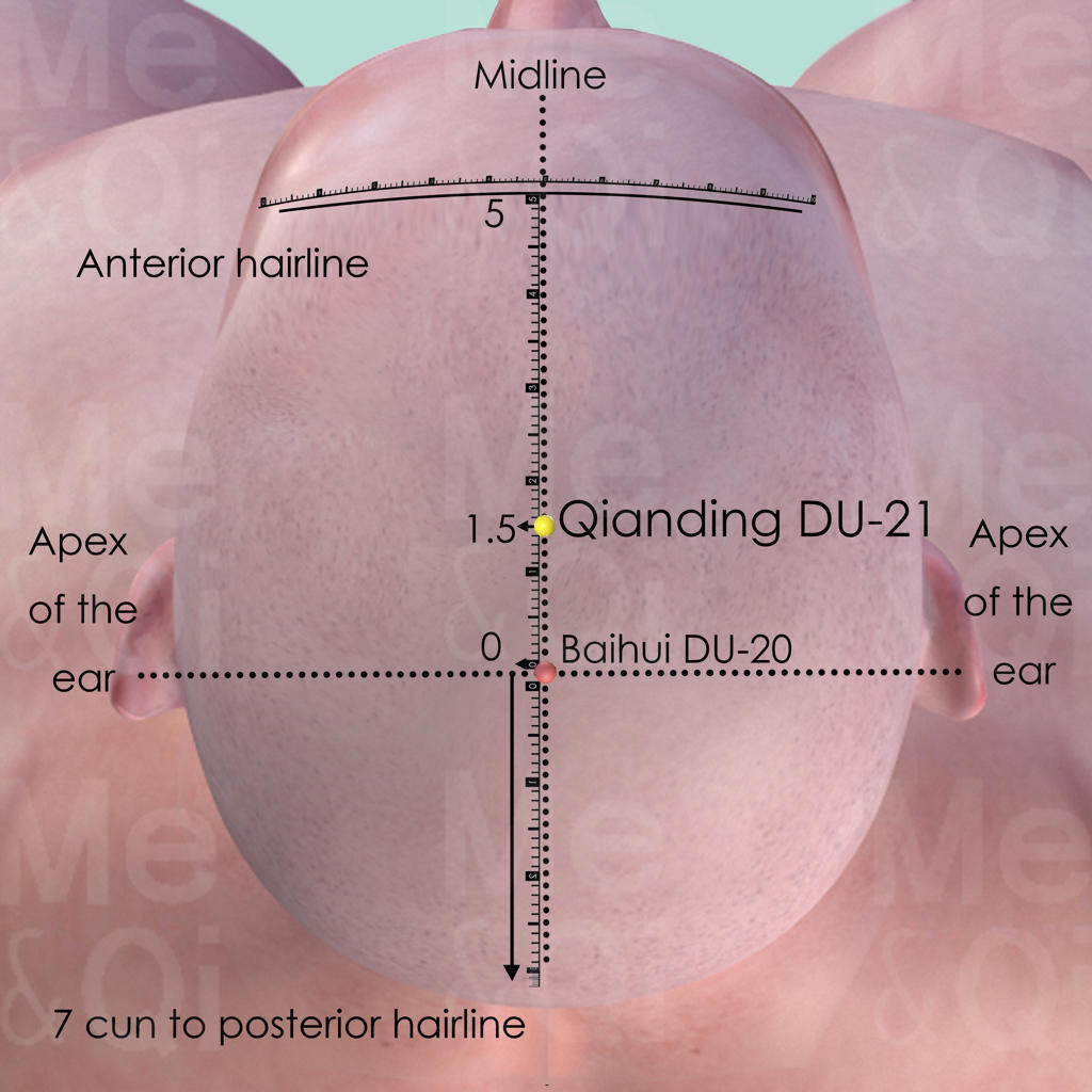 First locate Baihui DU-20 at the junction of a line connecting the apex of the ears and the midline. Then locate Qiangding DU-21 1.5 cun anterior to Baihui DU-20.