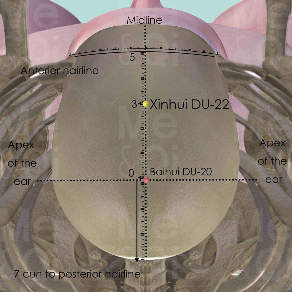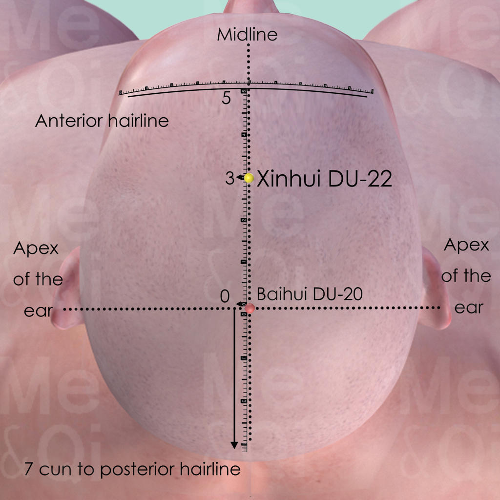 0.5–1 cun transversely. Caution with infants whose fontanelle has not yet closed, as Xinhui DU-22 is located on the anterior border of the fontanelle.