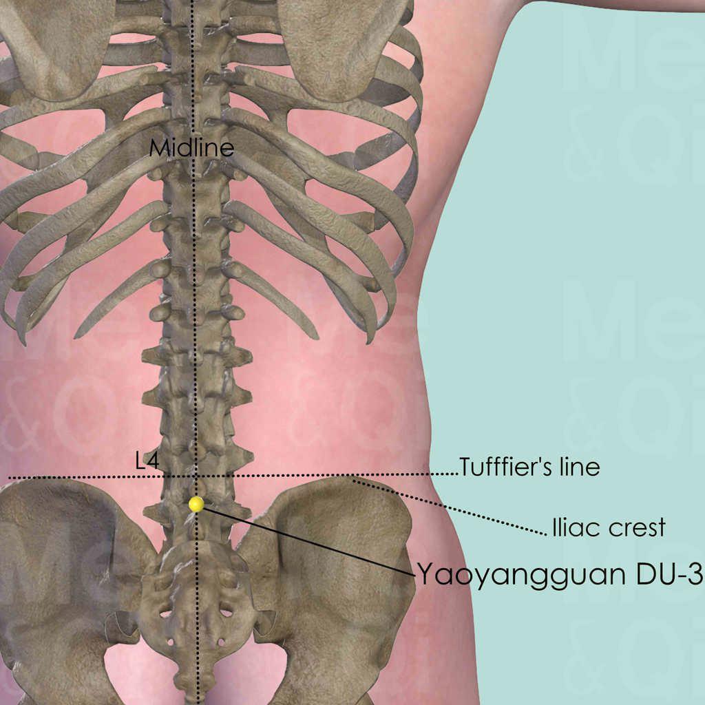 Locate the Tufffier's line, which connects the two most superior points on the iliac crest. It intersects with the 4th lumber vertebra. Locate Yaoyangguan DU-3 below the spinous process of the 4th lumber vertebra (L4) on the midline.
