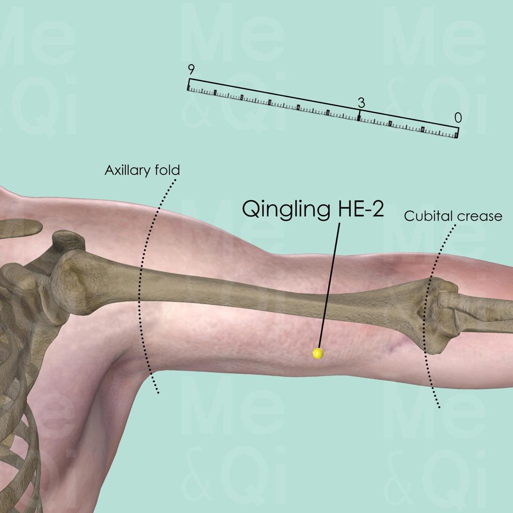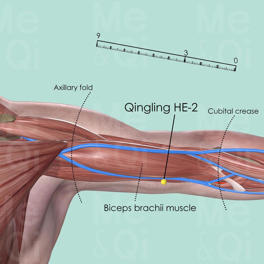With the elbow flexed, measure 3 cun from the ulner end of the cubital crease towards the axilla. Qingling HE-2 is in a depression on the medial border of the biceps brachii muscle.