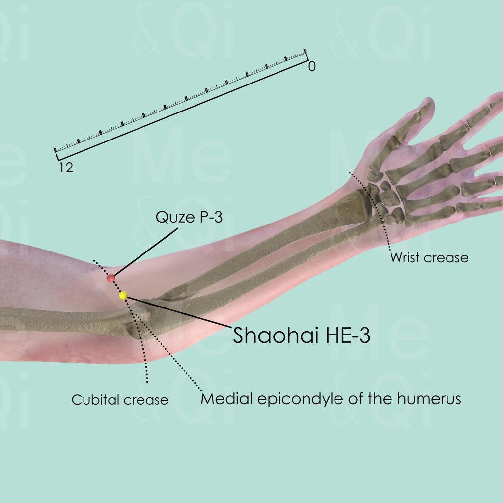 This point should be located with the elbow slightly flexed and the forearm in a supinated position. Find the ulnar end of the transverse cubital crease and palpate towards the medial epicondyle of the humerus. Shaohai HE-3 is located in a depression approximately midway between Quze P-3 and the medial epicondyle. Another method, with the elbow fully flexed, HE-3 is located directly at the medial end of the transverse crease.