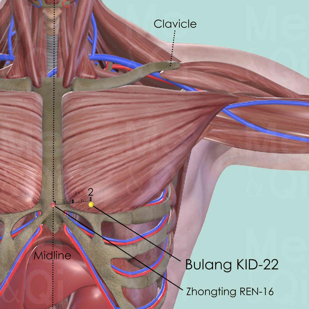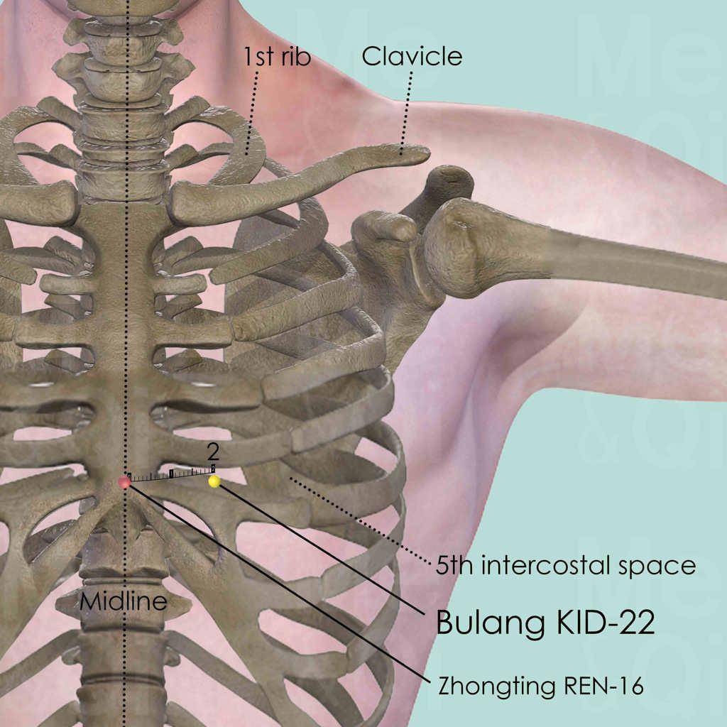 First identify the 5th intercostal space by counting 5 spaces down from the clavicle. Bulang KID-22 is on this space and also 2 cun lateral to the anterior midline. Zhongting REN-16 is at the level of the 5th intercostal space but on the anterior midline.