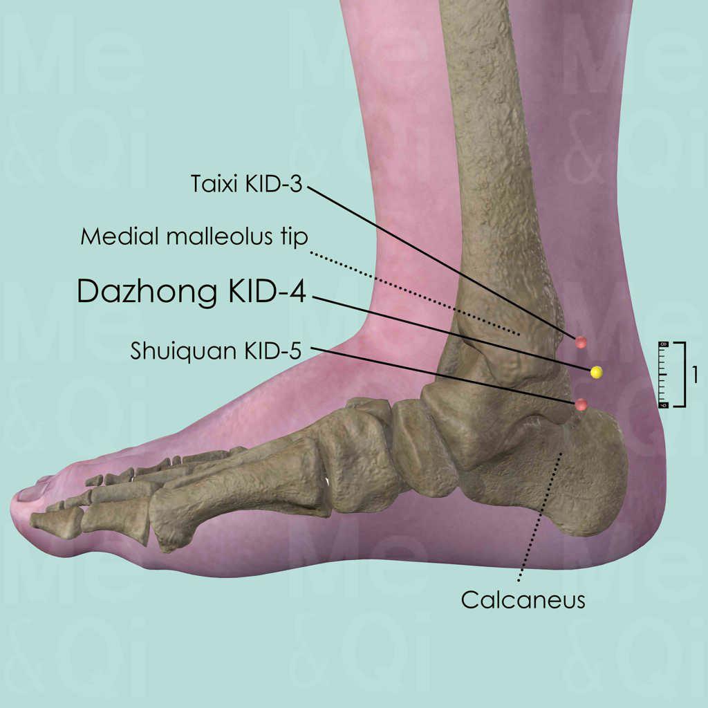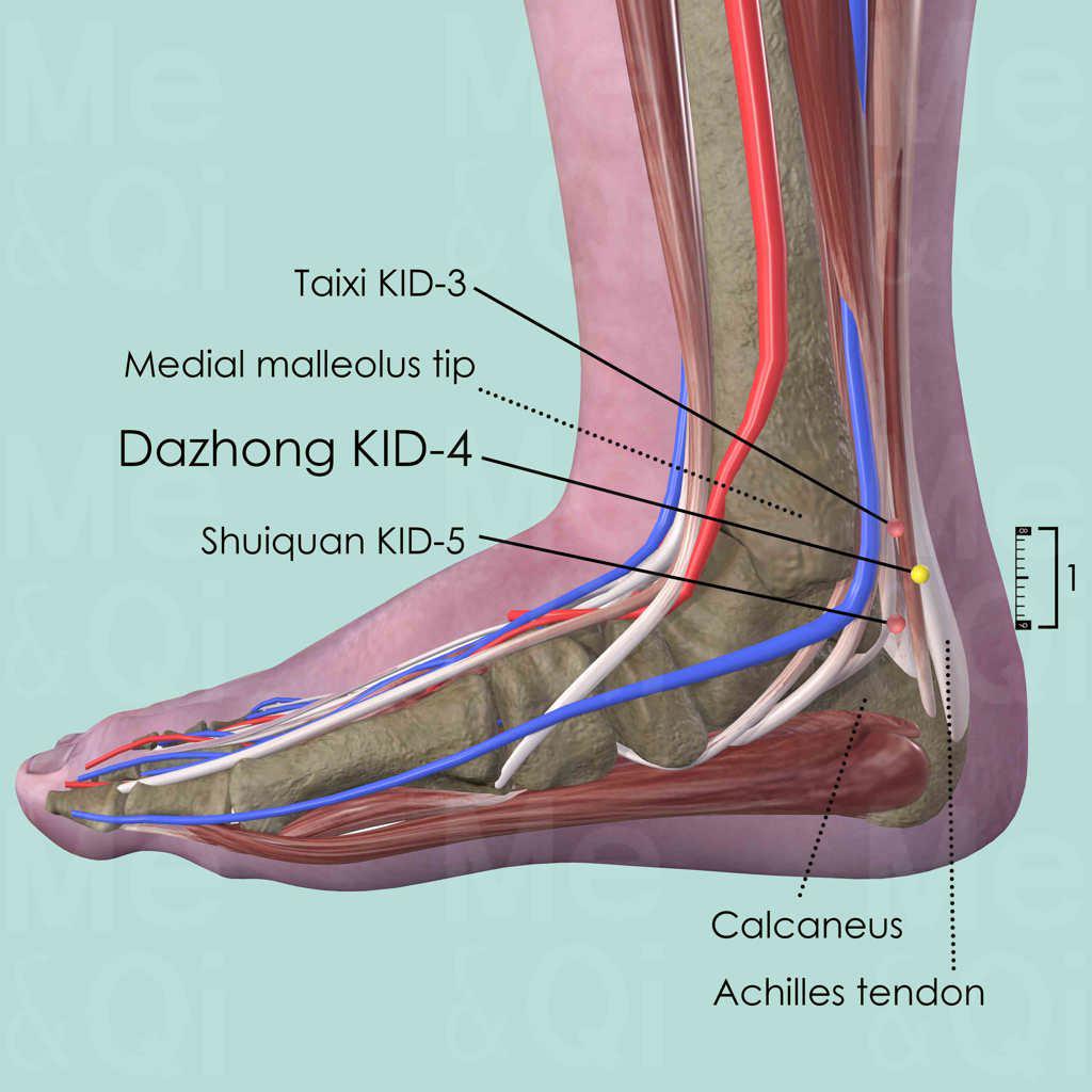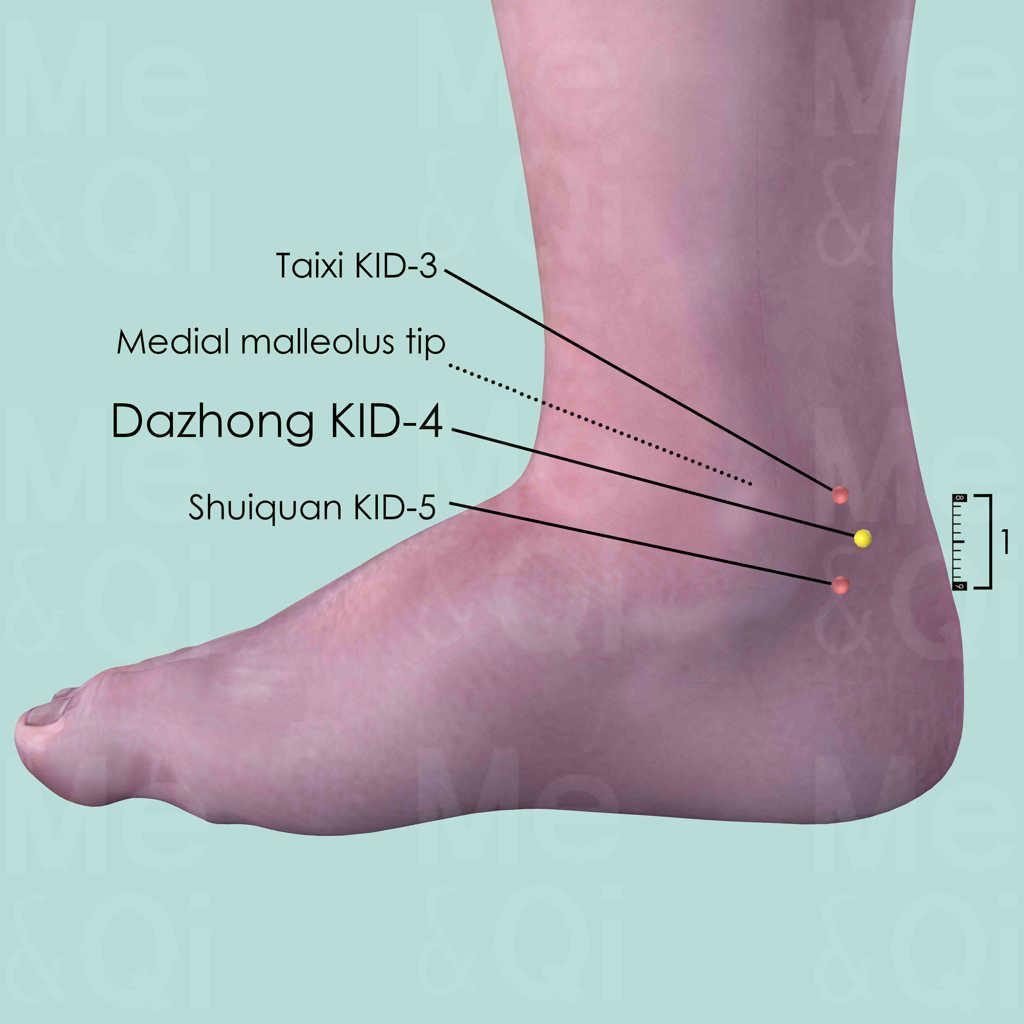From the tip of the medial malleolus, draw a horizontal line to the medial border of the Achilles tendon. From there, measure 0.5 cun in a distal direction. Dazhong KID-4 is in a depression anterior to the Achilles tendon, slightly superior to its insertion at the calcaneus. Or: the point is located posterior to the midpoint of a line connecting Taixi KID-3 and Shuiquan KID-5 anterior to the Achilles tendon.