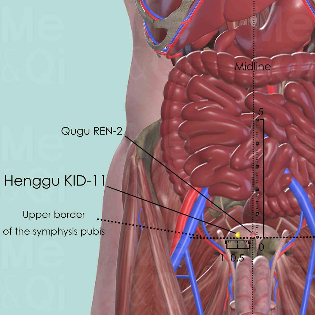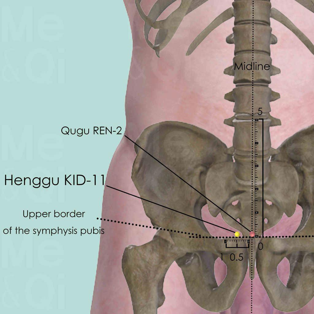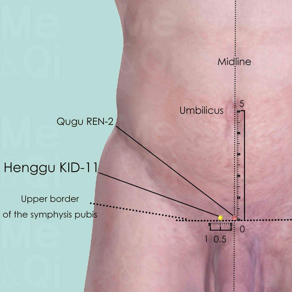 Palpate the upper border of the pubic symphysis and identify Henggu KID-11 directly superior to its bony margin and 0.5 cun lateral to the midline.