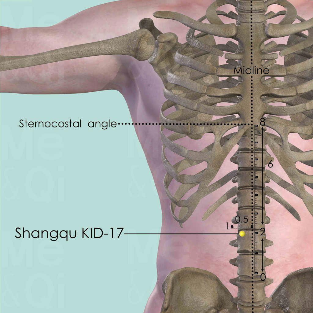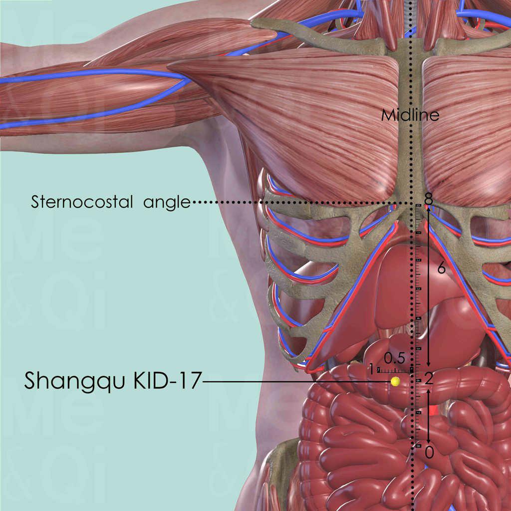 Divide the distance between the umbilicus center and the sternocostal angle into 8 equal parts. Each part is about 1 cun. Shangqu KID-17 is 2 cun above the umbilicus and 0.5 cun lateral to the anterior midline.