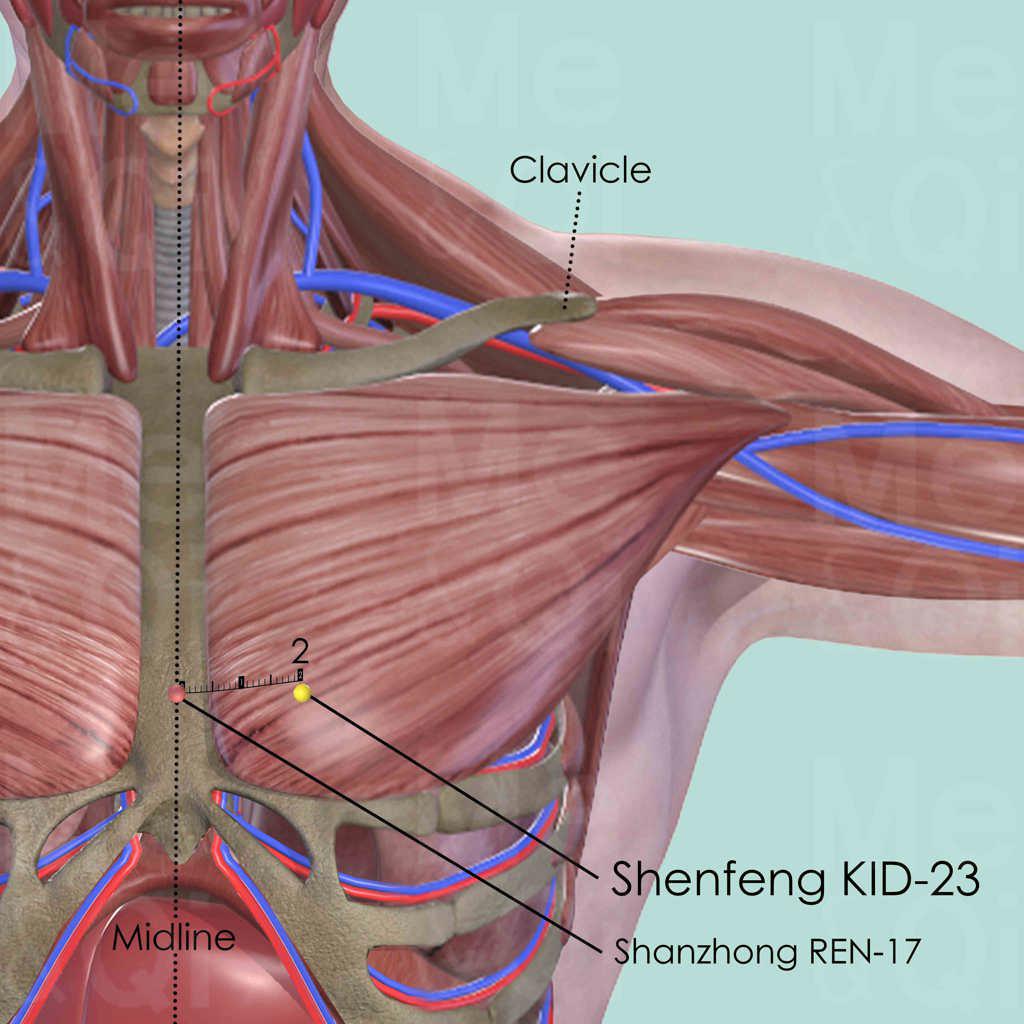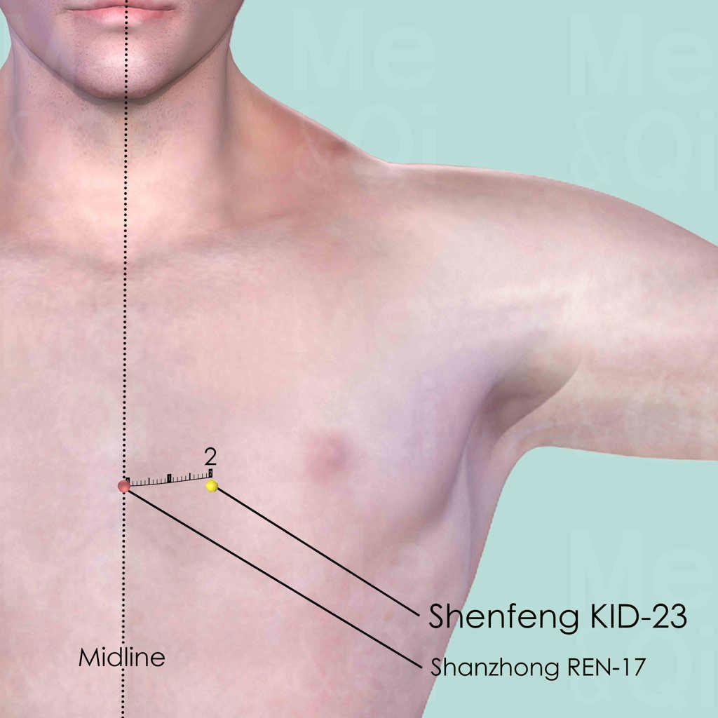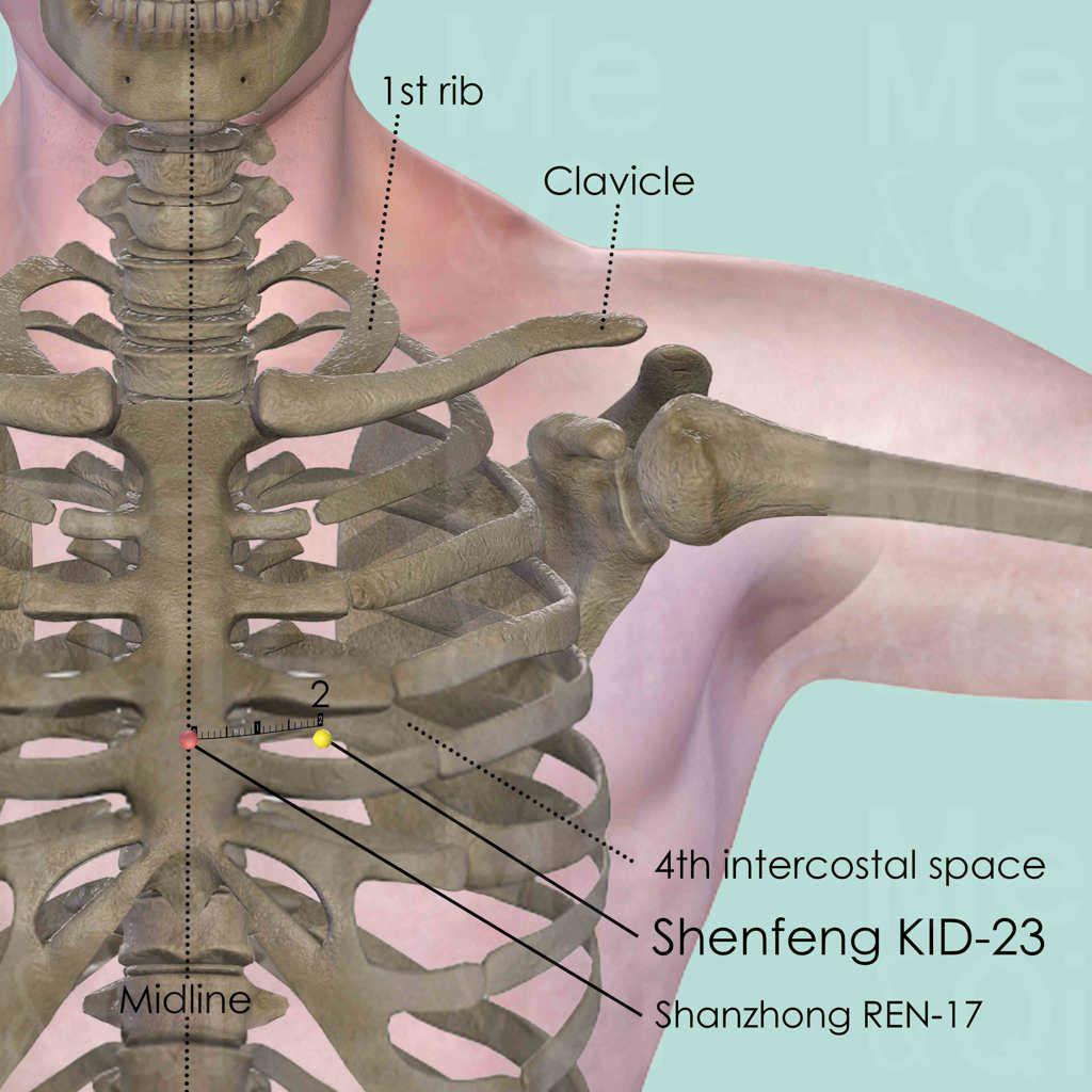 First identify the 4th intercostal space by counting 4 spaces down from the clavicle. Shenfeng KID-23 is on this space and also 2 cun lateral to the anterior midline. Shanzhong REN-17 is at the level of the 4th intercostal space but on the anterior midline.