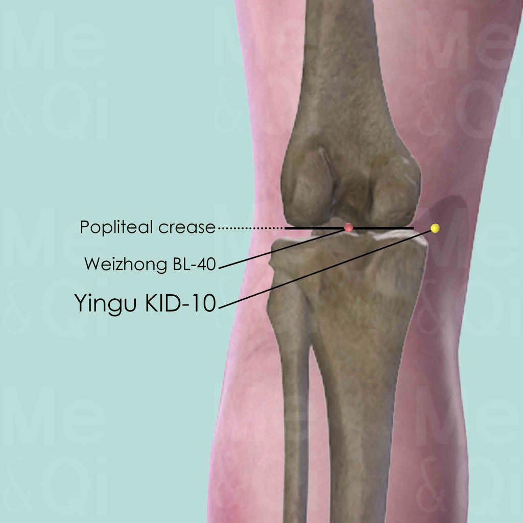 Flex the knee at less than 90° and press the heel against the floor to reveal the tendons of the semimembranosus and semitendinosus muscles in the popliteal crease. Locate Yingu KID-10 in a small gap between the more prominent tendon of the semitendinosus muscle and the less obvious tendon of the semimembranosus muscle.